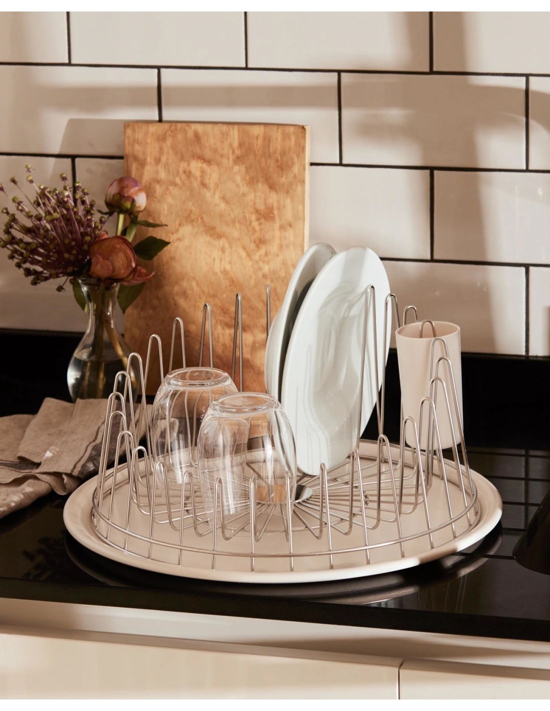 Der von Pauline Deltour entworfene A Tempo-Geschirrabtropfer von Alessi macht aus einem Alltagsgegenstand ein Designobjekt. Die Drahtstruktur wirkt leicht und rhythmisch und bietet Platz für Teller, Gläser und Besteck.