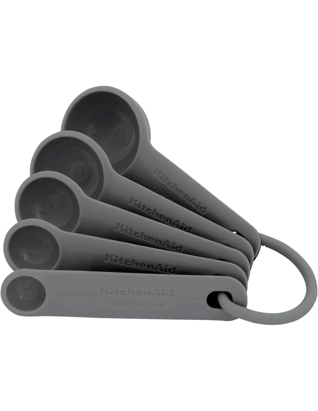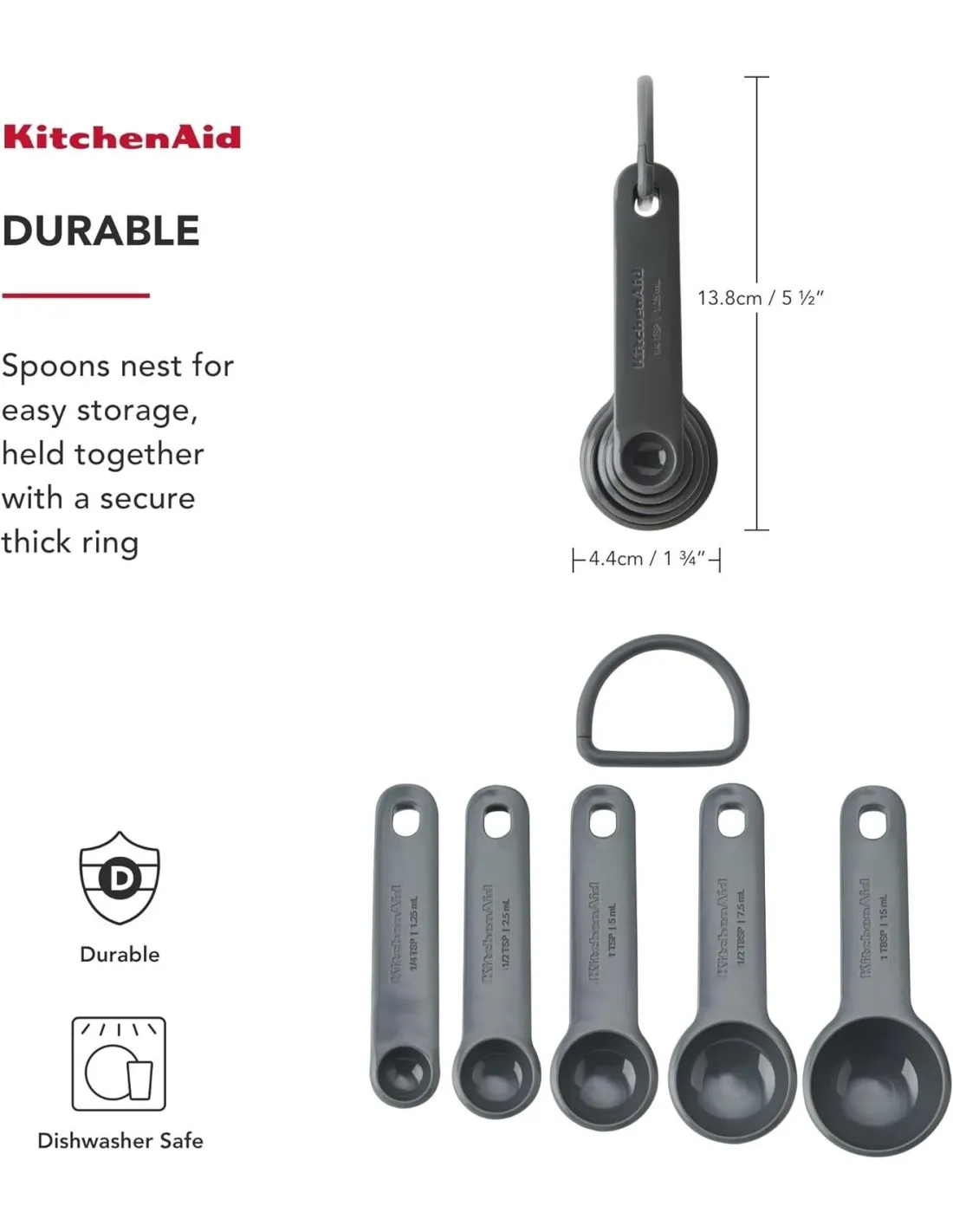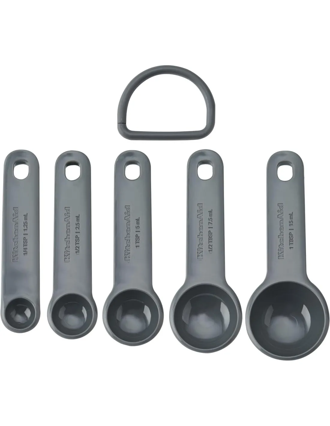 Dieses KitchenAid Messlöffel-Set enthält fünf verschiedene Löffelgrößen: ¼ Teelöffel (1,25 ml), ½ Teelöffel (2,5 ml), 1 Teelöffel (5 ml), ½ Esslöffel (7,4 ml) und 1 Esslöffel (15 ml). Diese Löffel eignen sich sowohl für nasse als auch für trockene Zutaten. Jeder Löffel ist langlebig und BPA-frei und hat seine Größe in leicht lesbaren Buchstaben auf dem Griff aufgedruckt, sowohl in metrischen als auch in US-Einheiten. Die Löffel sind so konzipiert, dass sie ineinander gesteckt werden können. Ein dicker Ring hält sie zusammen und erleichtert die Organisation und Aufbewahrung. Die Löffel sind spülmaschinenfest (oberes Rack empfohlen) und lassen sich leicht reinigen.