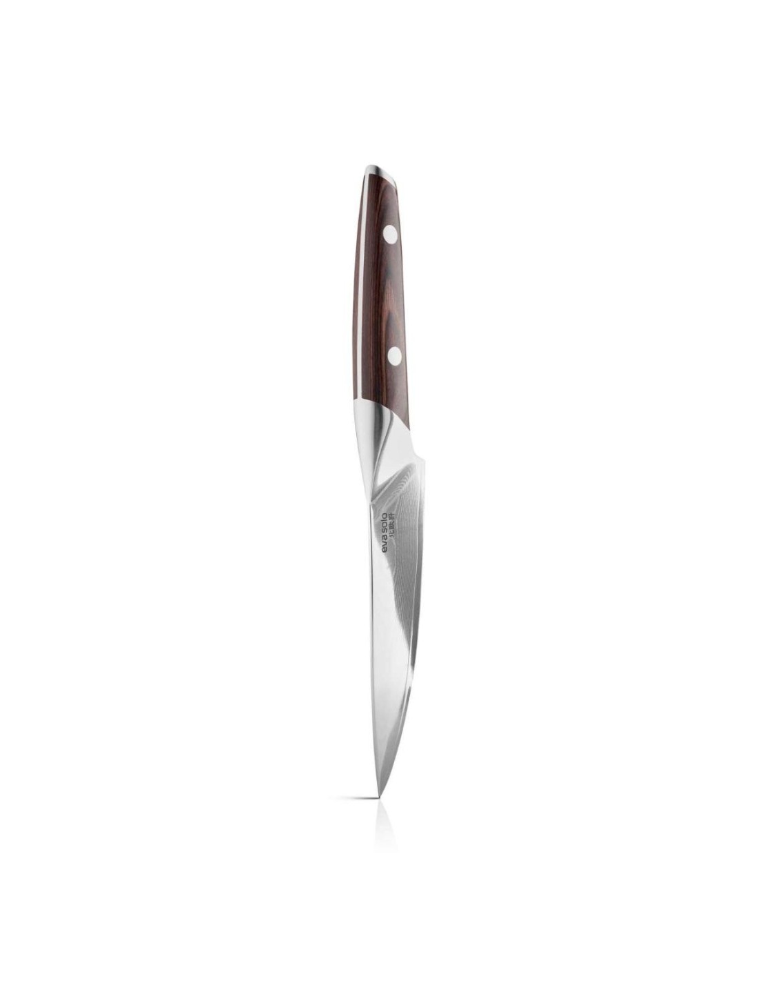 Das Nordic Kitchen Gemüsemesser wurde speziell entwickelt, um selbst das widerstandsfähigste und härteste Gemüse zu durchschneiden. Dies erleichtert das Schneiden, Würfeln, Julienne- und Batonnet-Gemüse, eignet sich aber auch perfekt zum präzisen Schneiden von Obst. Die Klinge ist aus 67 Lagen Damaststahl (10Cr15CoMoV) geschmiedet. Das komplexe Herstellungsverfahren führt zu einer exquisit gemusterten Klinge, die eine hervorragende Kombination aus Festigkeit, Flexibilität und Haltbarkeit bietet. Die Klingenhärte beträgt beeindruckende HRC 60 ±2, um langanhaltende Schärfe und minimalen Wartungsaufwand zu gewährleisten. Der Schaft aus Pakkaholz liegt stabil und angenehm in der Hand, während die schützende Parierstange gleichzeitig als natürliche Daumenauflage dient. Ein vielseitiges Präzisionsmesser in handlicher Größe
