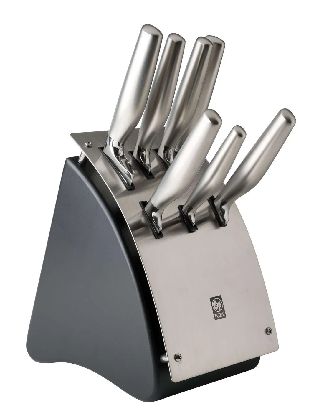 Platina 7-teilige runde Messerblöcke werden mit geschmiedeten Klingen aus hochwertigem rostfreiem Stahl mit Chrom-Molybdän-Vanadium (X50CrMoV15) hergestellt. Geschmiedete Klingen werden durch Erhitzen des Stahls und anschließendes Formen des Teils hergestellt. Sie zeichnen sich durch einen robusten Kropf aus, sind schwerer, können eine höhere Härte erreichen und müssen weniger oft geschärft werden. Einfaches und ergonomisches Design. Die Griffe sind aus rostfreiem Stahl AISI 304 hergestellt und sind auch mit nassen Händen rutschfest.