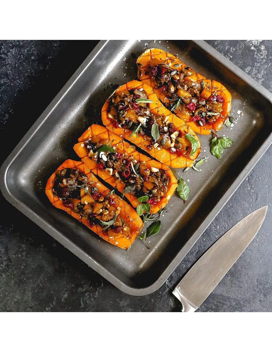Mit der MasterClass Bratpfanne (39 x 28 x 7 cm) mit Antihaftbeschichtung erzielen Sie jedes Mal mühelos hervorragende Bratergebnisse. Sie eignet sich perfekt zum Braten von großen Hähnchen, die saftig und knusprig werden, von saftigen Rinderkeulen, goldgelben Bratkartoffeln und vielem mehr. Sie können damit auch Lasagne und Hirtenkuchen in Familiengröße sowie größere Torten zubereiten. Dieser Bräter ist aus handelsüblichem, 1 mm starkem Kohlenstoffstahl gefertigt. Die galvanische Beschichtung sorgt für maximale Robustheit und Langlebigkeit, so dass Sie sich darauf verlassen können, dass Sie stets die Ergebnisse erzielen, die man mit kulinarischen Experten in Verbindung bringt. Dank der gerollten Kanten rostet sie auch nicht. Außerdem nimmt sie die Hitze Ihres Ofens besser auf und verteilt sie gleichmäßiger. So bleibt zum Beispiel die Lammschulter außen knusprig und in der Mitte roh oder nicht gar. Sie müssen sich auch keine Sorgen machen, dass das Essen an dieser Pfanne kleben bleibt. Sie ist mit einer doppelten Quantum II-Antihaftbeschichtung versehen. Dadurch löst die Pfanne Fleisch, Geflügel und Gemüse mühelos von der Oberfläche ab. Die Quantum II-Beschichtung ist frei von Chemikalien wie Bisphenol A (BPA), Polytetrafluorethylen (PTFE) und Perfluoroctansäure (PFOA), was diese Bratpfanne zu einer sicheren Wahl beim Kochen macht. Sie ist auch kühlschrank- und gefrierschrankgeeignet, d. h. Sie können Ihr Fleisch oder Geflügel vor dem Braten im Kühlschrank ruhen lassen, was wiederum das Erreichen eines professionellen Ergebnisses erheblich erleichtert. Sie können die Hochleistungs-Antihaftbeschichtung ganz einfach mit warmem Wasser abwaschen oder in der Spülmaschine reinigen.