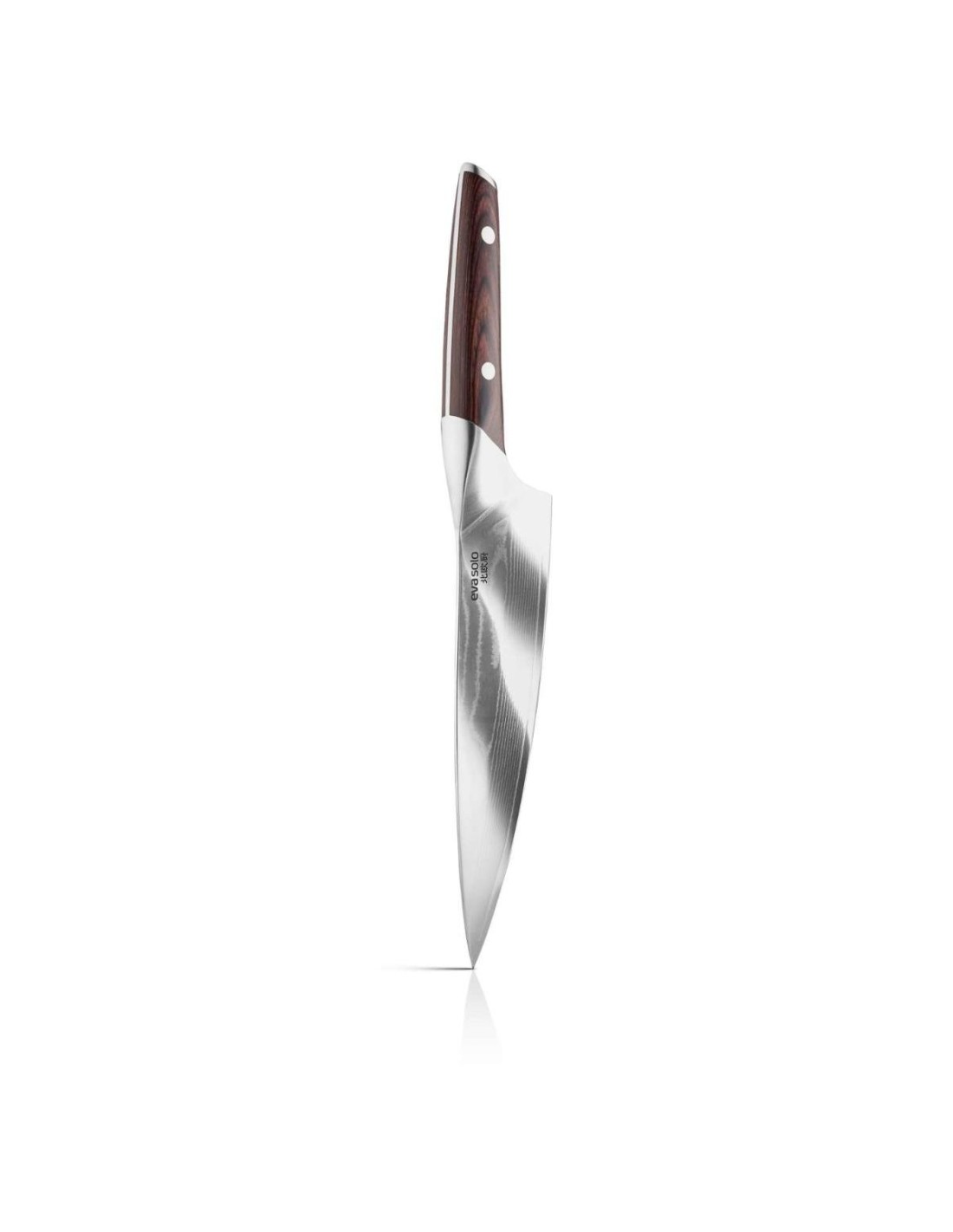 Das Nordic Kitchen Kochmesser vereint Präzision, Effizienz und Vielseitigkeit in einem perfekten Allrounder. Mit seiner 20 cm langen, sanft gebogenen Schneide schneidet, schneidet und hackt dieses Messer mit beeindruckender Leichtigkeit und Kontrolle. Die Klinge ist aus 67 Lagen Damaststahl (10Cr15CoMoV) geschmiedet. Das komplexe Herstellungsverfahren führt zu einer exquisit gemusterten Klinge, die eine hervorragende Kombination aus Festigkeit, Flexibilität und Haltbarkeit bietet. Die Klingenhärte beträgt beeindruckende HRC 60 ±2, um langanhaltende Schärfe und minimalen Wartungsaufwand zu gewährleisten. Der Schaft aus Pakkaholz liegt stabil und angenehm in der Hand, während die schützende Parierstange gleichzeitig als natürliche Daumenauflage dient. Ein perfekt ausbalanciertes Messer, das für fast jede Schneidaufgabe geeignet ist.