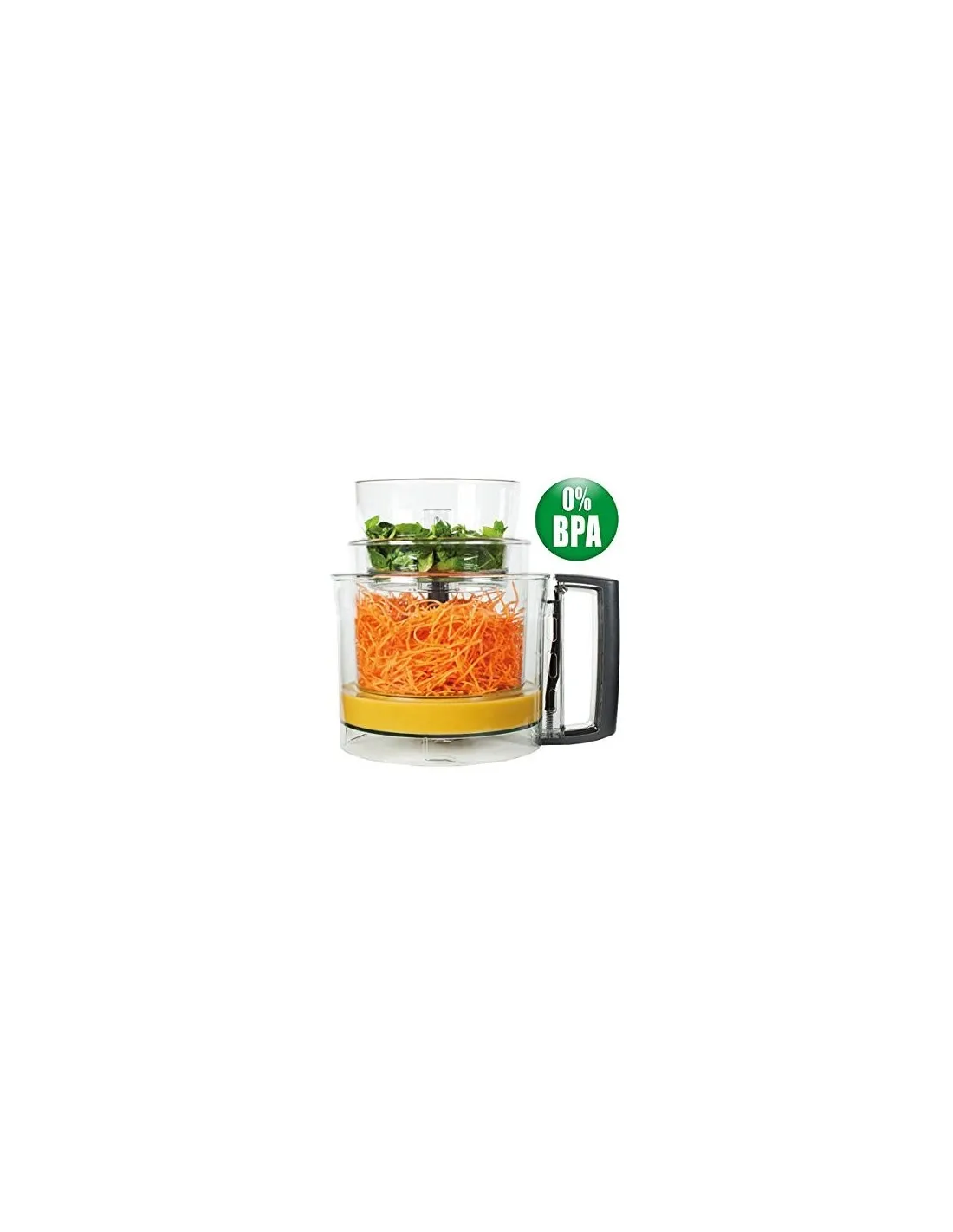 Die Edelstahlmesser sorgen weiterhin für einen perfekten Schnitt. Der große Einfüllschacht ist ideal zum Einfüllen von großen Obst- und Gemüsesorten sowie Pommes-Frites oder Stäbchen-Scheiben - insgesamt hat der Einfüllschacht ein Fassungsvermögen von bis zu 1,3 Litern für Flüssigkeiten und 1,2 Kilogramm für Kuchenteig.