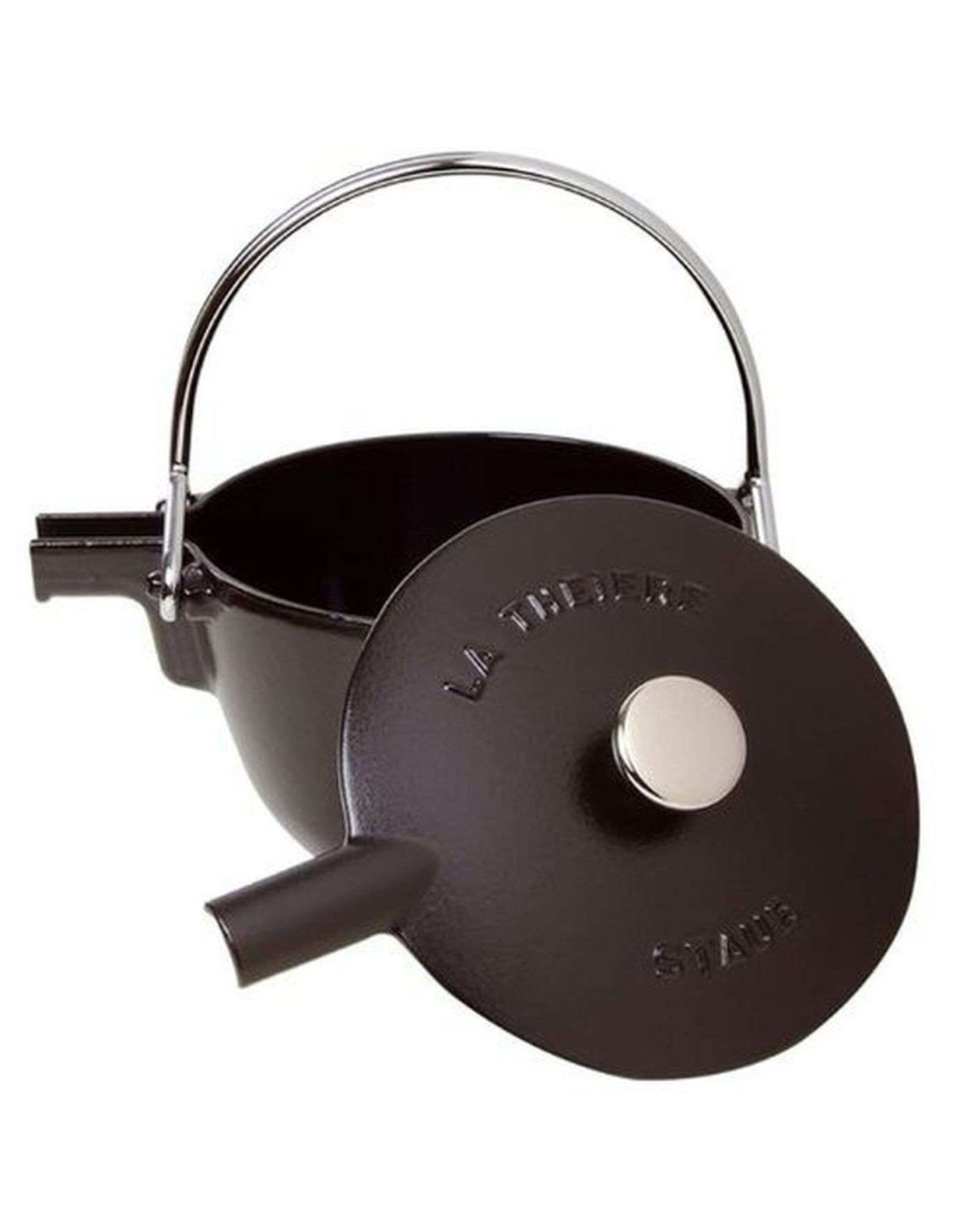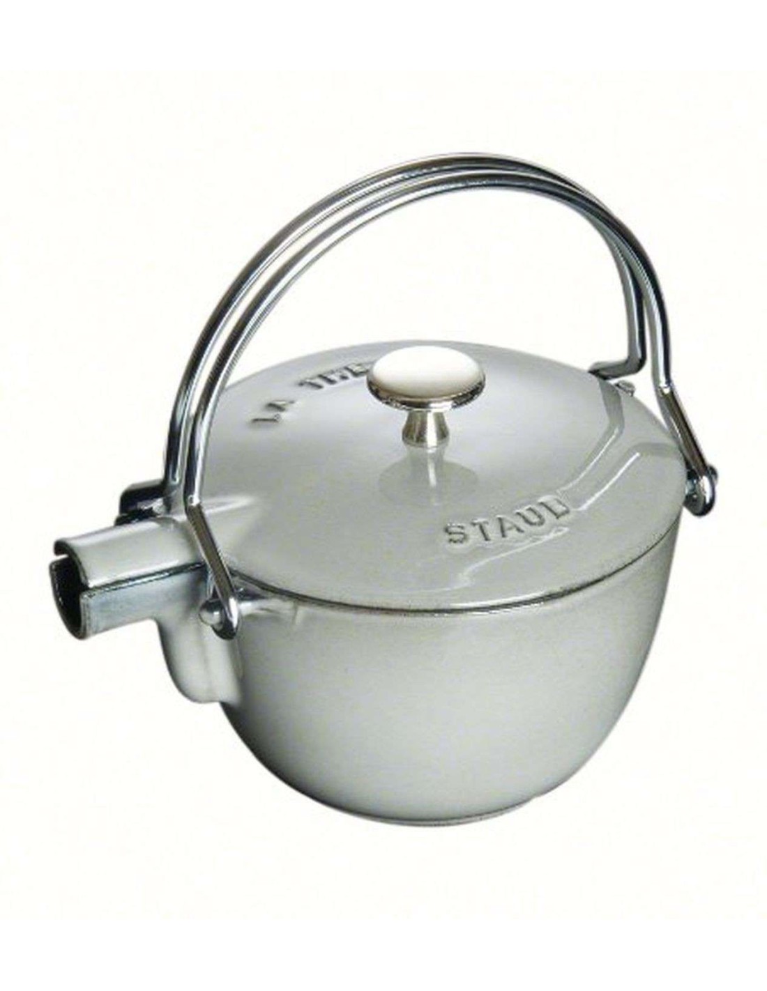 Für vollendeten Teegenuss sollte das Wasser recht schnell heiß werden und dann lange warm bleiben. Bei der Teekanne von Staub sorgen dafür die außerordentlichen Fähigkeiten des Gusseisens: Es nimmt die Hitze sehr schnell auf und gibt sie gleichmäßig und stetig ins Innere ab. Unterstützt wird dieser Effekt beim Kochgeschirr von einer mattschwarzen Emaillierung. Der runde Teekessel ist in dem Farbton Grenadine gehalten. Diese tiefrote Farbe fällt angenehm auf, sodass Sie die Teekanne, die auch als Wasserkessel verwendet werden kann, auch auf dem Tisch platzieren können. Ihre Gäste profitieren von einem warmen Teegetränk, das mit Hilfe einer Aufhängevorrichtung im Deckel zubereitet wurde. In diese Vorrichtung wird das Teesieb eingehängt. Die Edelstahlgriffe bleiben angenehm kühl und helfen beim sicheren Ausgießen, da sie den Deckel fest verschließen. Der Teekessel eignet sich für alle Arten von Herden, auch für Induktionsherde. Da Sie das erhitzte Wasser nicht erst in eine vielleicht noch kalte Teekanne umfüllen müssen, sondern das Teesieb in den Deckel einhängen können, sparen Sie zudem Energie. Auch die lange Warmhaltezeit des Gusseisens unterstützt das Energiesparen. Der Tee-Wasserkessel misst rund 16,5 cm und fasst 1,15 l, sodass Sie ihn ohne Weiteres auch für mehrere Personen am Tisch befüllen können. Mit diesem Kessel von Staub gelingt Ihnen leckerer Tee für entspannte Stunden.