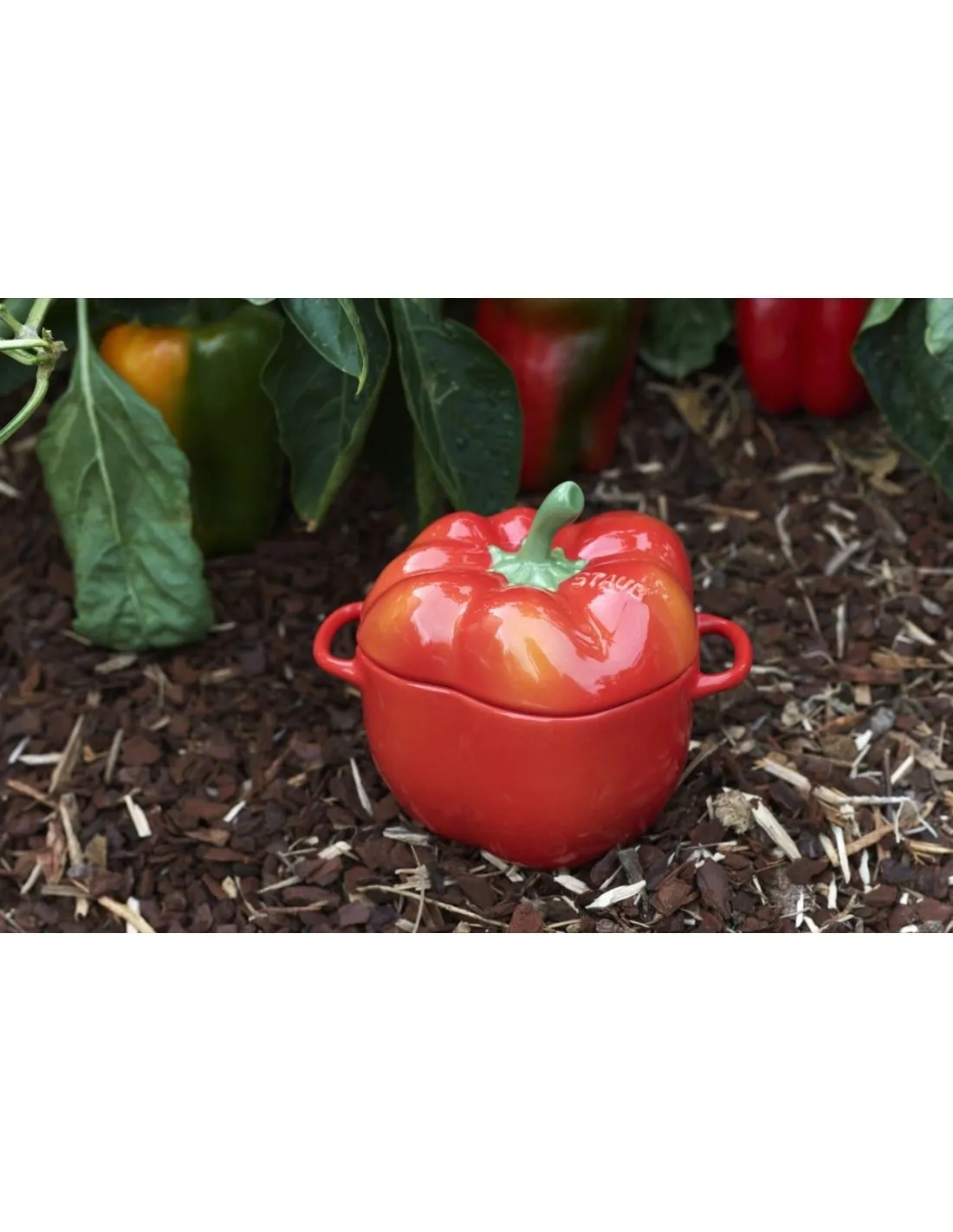 In dieser Cocotte aus Keramik lassen sich wunderbare Gemüsegerichte und kleine Aufläufe mit einer krossen Schicht aus würzigem Käse zaubern. In dem orangeroten Kunstwerk in Form einer Paprika kommen Ihre Gerichte auch optisch auf der Tafel voll zur Geltung, als schöne orangerote Farbtupfen in der Tischdekoration. Anschließend geben Sie das Geschirr einfach in die Spülmaschine. Mit dem naturalistischen Design dieser Cocotte von STAUB in Form einer orangeroten Paprika, holen Sie sich ein Stück Garten in Ihre Küche. Durch die natürliche Form macht nicht nur das Kochen, sondern auch das Servieren mehr Freude. Das kleine Kunstwerk mit einem Durchmesser von 12 cm hat ein Volumen von 0,5 l und eignet sich damit ideal für die Zubereitung einzelner Portionen: Bringen Sie Suppen, Gemüse- und Fleischgerichte, sowie Beilagen direkt vom Ofen auf den Tisch! Die von der Natur inspirierte Cocotte im Paprika-Design besteht aus Keramik und ist daher backofen-, mikrowellen- und spülmaschinengeeignet. Dank der besonderen Eigenschaften des Materials kann sie Wärme seht gut speichern und gleichmäßig an die Speisen abgeben. Die idealen Voraussetzungen für ein ausgezeichnetes Gratin. Mit dieser Keramikschüssel der Serie Gemüsegarten von STAUB erleben Sie authentisches Kochen wie in Frankreich.