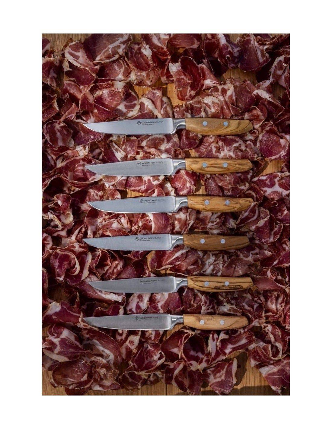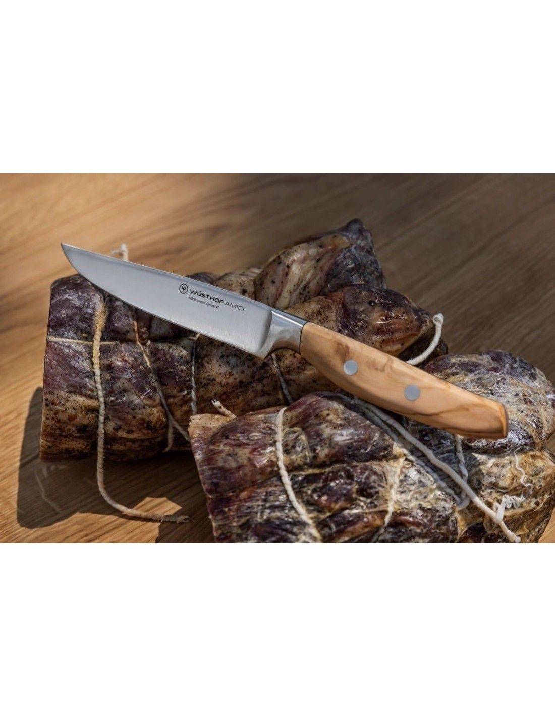 Als Teil der Amici Serie verbindet dieses Messer geschmiedete Konstruktion mit einem Griff aus kalabrischem Olivenholz, das eine markante natürliche Maserung besitzt und angenehm in der Hand liegt. Es ist eine ausgezeichnete Wahl für alle, die ein elegantes, funktionales und hochwertiges Tafelmesser suchen.