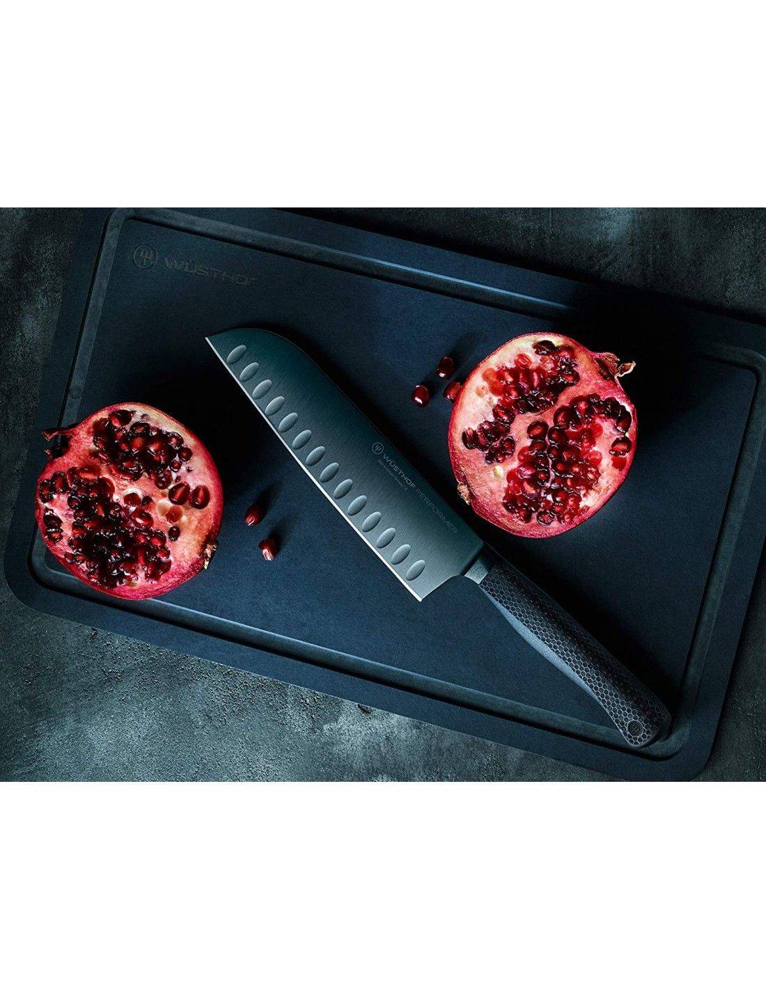 Wüsthof hebt bei dieser Serie die tiefschwarze Diamond-Like Carbon (DLC)-Beschichtung hervor, die die Reibung reduziert und ein flüssigeres Schneiden ermöglicht, während die Klinge besonders hitzebeständig, kratzfest und widerstandsfähig gegen Beschädigungen wird. Der Griff mit Hexagon-Power-Grip-Struktur sorgt für sicheren, rutschfesten Halt, während der full bolster eine ideale Balance zwischen Klinge und Griff gewährleistet.