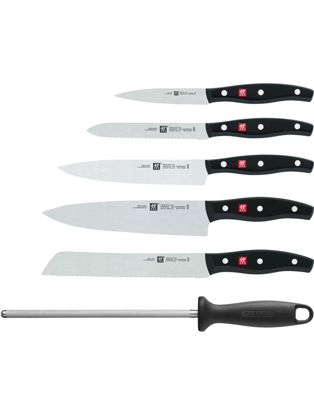 Dieser siebenteilige Messerblock ist ideal für Hobbyköche und absolute Anfänger, die von Anfang an das richtige Messer benutzen wollen. Der ZWILLING-Messerblock besticht durch sein auffälliges Design aus Bambus und ist mit einem Schälmesser, einem Universalmesser, einem Fleischmesser, einem Kochmesser und einem Brotmesser ausgestattet, so dass Sie für fast jede Gelegenheit das richtige Messer zur Hand haben. Zum Schärfen der Klingen ist auch ein Wetzstahl mit Kunststoffgriff enthalten. Die Klingen der Universalmesser bestehen aus dem bewährten ZWILLING-Spezialformel-Stahl und wurden durch ein spezielles Eishärteverfahren weiter veredelt. Die in diesem Verfahren hergestellten FRIODUR-Klingen sind sehr flexibel, korrosionsbeständig und schnitthaltig, so dass sie sich kaum abnutzen und lange scharf bleiben. Der Griff des Messers ist mit drei Nieten versehen und auch das rote ZWILLING-Logo ist sehr auffällig. Mit diesem Messerblock aus der Serie TWIN Pollux haben Sie immer das richtige Messer zur Hand. - V-Schliff - ein zweistufiges Verfahren, das zu einer feinen symmetrischen Schneide mit einem Messerwinkel von ca. 15 Grad pro Seite führt - Gestanzt aus rostfreiem Bandstahl mit hohem Kohlenstoffgehalt - FRIODUR eisgehärtete Klinge für außergewöhnliche Schnitthaltigkeit und Korrosionsbeständigkeit - Ergonomischer Kunststoffgriff für ermüdungsfreies und sicheres Arbeiten, mit offenem Erl - Garantie: Lebenslange ZWILLING-Garantie