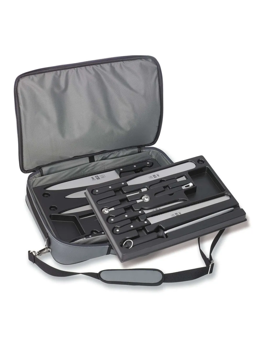 Technik Chef's attache case 15 Pieces are made of high quality blades stainless steel with chromium-molybdenum-vanadium (X50CrMoV15). POM handles with stainless steel rivets. Polyoxymethylene (POM) is a hard material with dimensional stability and resistance against high temperatures. The traditional design and ergonomics. Made of polyoxymethylene (POM) is non-slip even with wet hands. Good performance and less fatigue professionals. Includes: