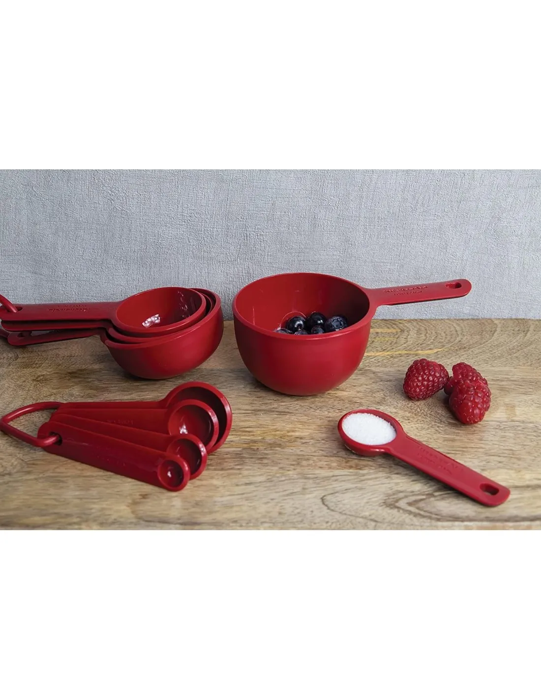 This KitchenAid measuring cup set includes four different cup sizes. These cups work with both wet and dry ingredients. Durable and BPA free, each cup has its size printed in easy-to-read letters on its handle, in both metric and American units. The cups are designed to nest, with a thick ring to secure them together for easy organisation and storage....
