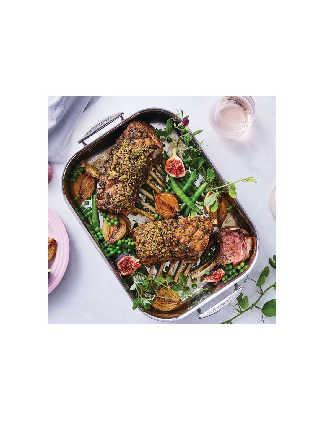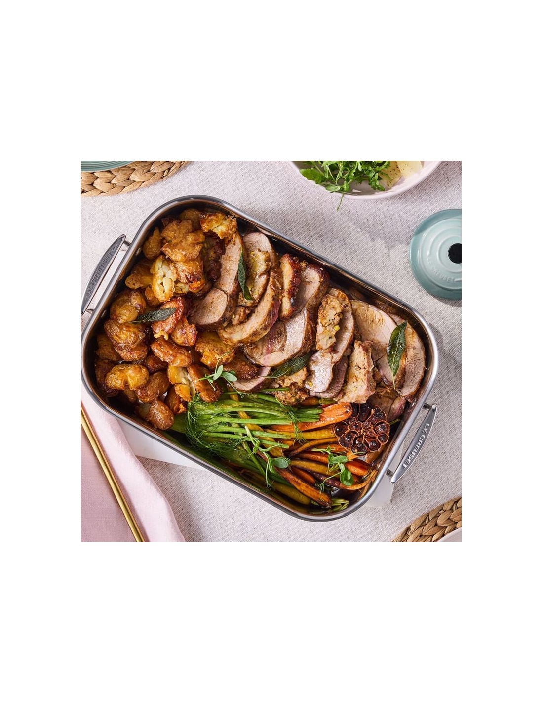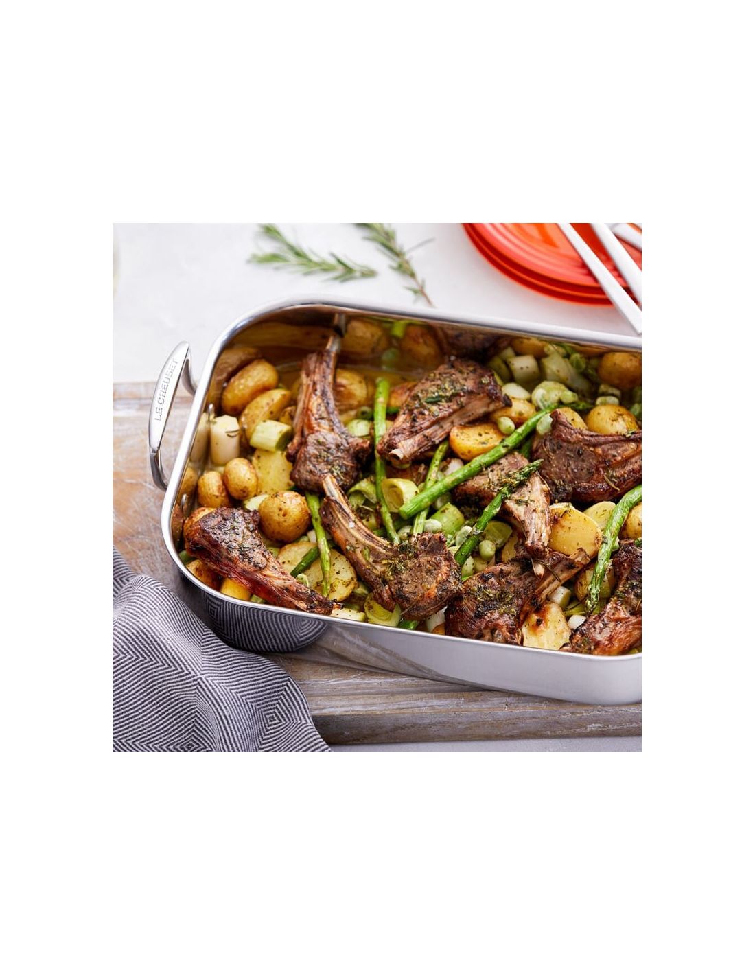 Le Creuset Signature Cast Iron Rectangular Roaster 33cm. The even heat distribution of this versatile enamelled Cast Iron Roaster makes it ideal for roasting meat and potatoes or cooking homemade lasagne and crumbles. When roasting meat, the dish can be placed on the hob for deglazing a gravy or sauce. Inspired by our iconic Cast Iron Casseroles, the new...
