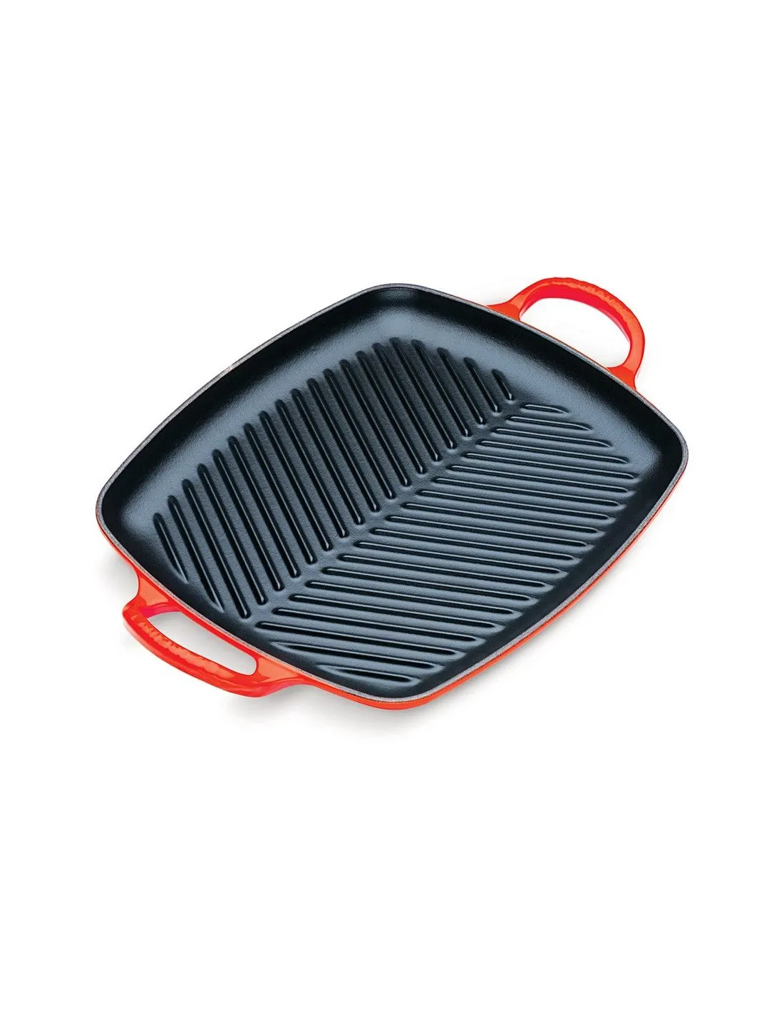 Our new Signature Rectangular Grill is ideal for searing meat, fish, vegetables, fruit or even bread with little or no oil for quick, delicious and healthier results. Made in cast iron, it will give all the delicious flavour of an outdoor grill, with all the convenience of indoor cooking. The ribbed base produces attractive, distinctive char lines on grilled food and allows any juices and oils to drain. The special surface design, split into two parts, allows to cook different types of food at the same time. Setting the Signature Rectangular Grill apart are also its two, large easy-grip handles and the compact design makes for easy storage. The Rectangular Grill’s interior is completely coated with Le Creuset's protective satin black enamelled finish making it very hygienic (no seasoning required) and ensuring there is no flavour transfer the next time you use the pan. Extremely durable, this long-lasting surface withstands high grilling temperatures and will not wear off or peel. Over time, it will develop a natural patina that is ideal for searing and frying. Suitable for use on all heat sources, including induction, and in the oven, the grill is available in a wide range of colours to suit all styles of home décor and comes with a reassuring lifetime guarantee.