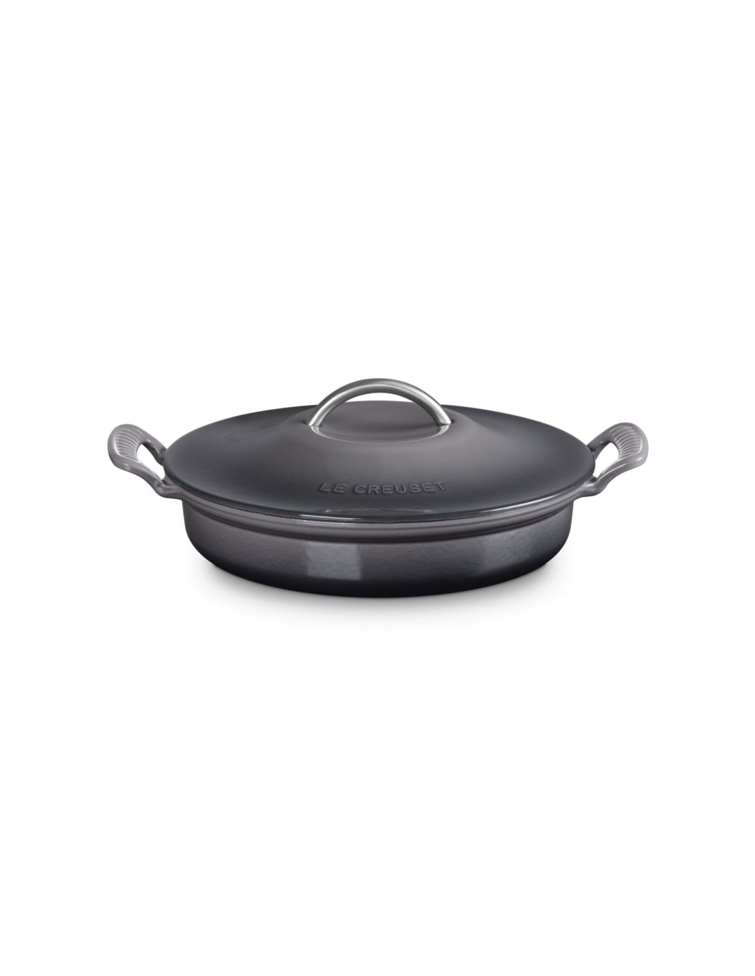 Crafted from enamelled cast iron, this shallow casserole delivers even heat for perfect searing, braising, and more. Its wide base and domed lid lock in moisture and flavour, while softened curves and stainless steel accents bring a modern touch to a timeless design. Built to last, easy to clean, and made for every kitchen moment.