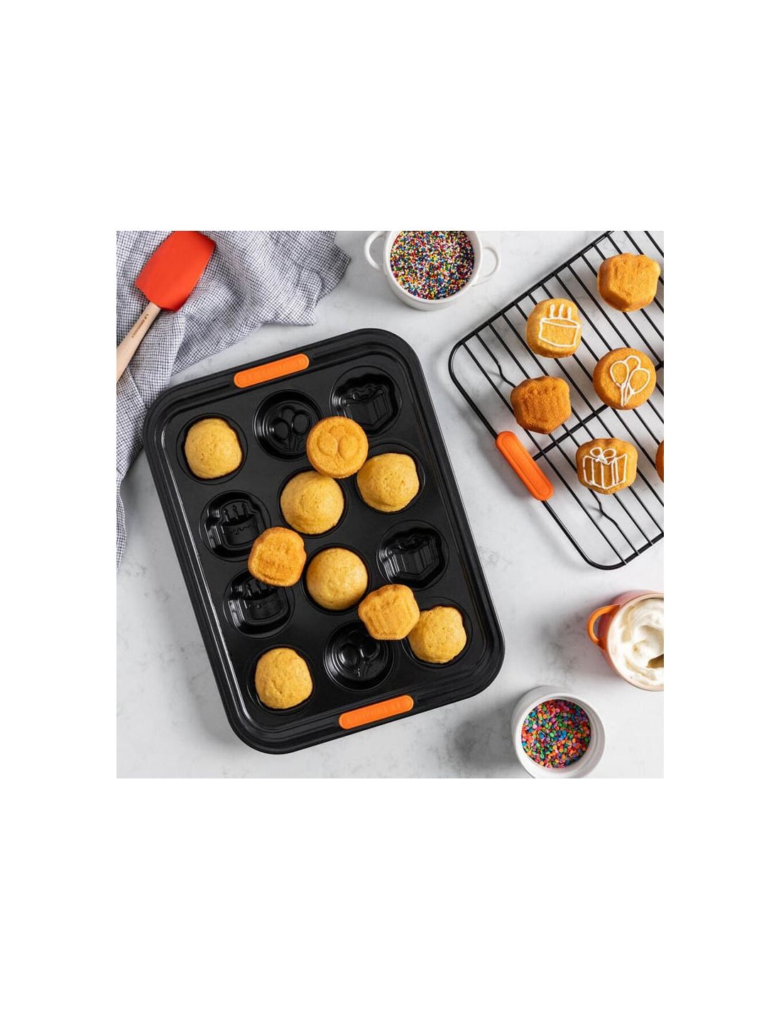 Our non-stick cooling rack is the perfect baking accessory. Slightly elevated with sturdy rack feet, it allows pastries to cool down after unmoulding and allows for air circulation so that pastries do not soften during the cooling process. It can also be used for decorating cakes with precision, as the excess frosting will drip down for a visually appealing result. The non-stick coating allows for easy cleanup afterwards.