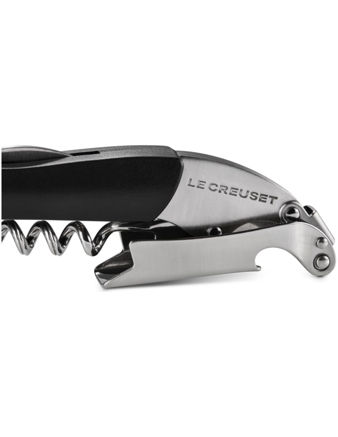The innovative design of the waiter's corkscrew maximizes one-step opening for fast, smooth cork removal and includes an integrated capsule-cutting blade and bottle opener. It features a classic black handle with ergonomic grip and is the perfect multi-tool for gift-giving.