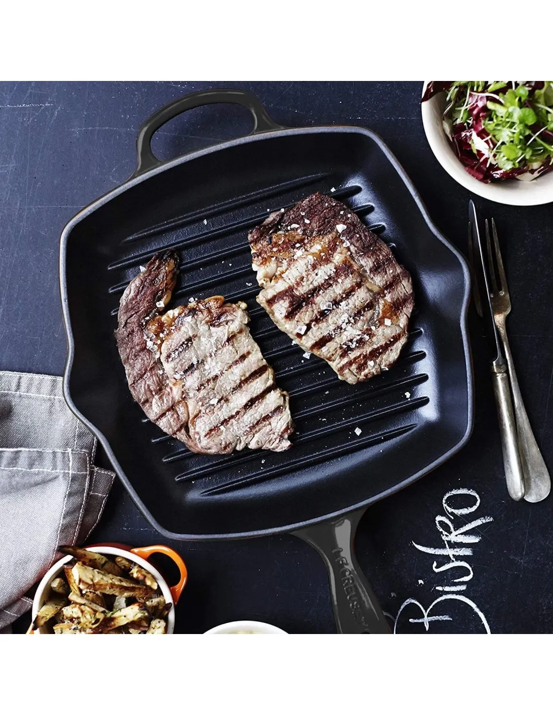As cast iron grills can reach high heat on a medium setting, you can seal your food quickly and lock in the moisture, nutrients and flavours, producing succulent tasty meals. It is a very healthy way of cooking too as the cooking fat drains away and collects below the ribs.The new helper handle sets this new Signature Square Grillit® apart from others, for extra ease of use and stability when lifting a full pan. The grill is coated with Le Creuset’s specialist satin black enamel finish. Durable and easy to clean, the satin black enamel interior has been especially designed to protect the pan (no seasoning is required) and is ideal for searing and grilling foods such as meat, fish and vegetables.