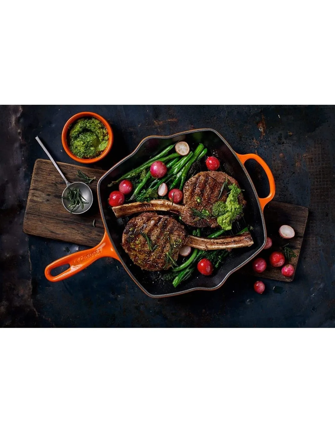 As cast iron grills can reach high heat on a medium setting, you can seal your food quickly and lock in the moisture, nutrients and flavours, producing succulent tasty meals. It is a very healthy way of cooking too as the cooking fat drains away and collects below the ribs.The new helper handle sets this new Signature Square Grillit® apart from others, for extra ease of use and stability when lifting a full pan. The grill is coated with Le Creuset’s specialist satin black enamel finish. Durable and easy to clean, the satin black enamel interior has been especially designed to protect the pan (no seasoning is required) and is ideal for searing and grilling foods such as meat, fish and vegetables.