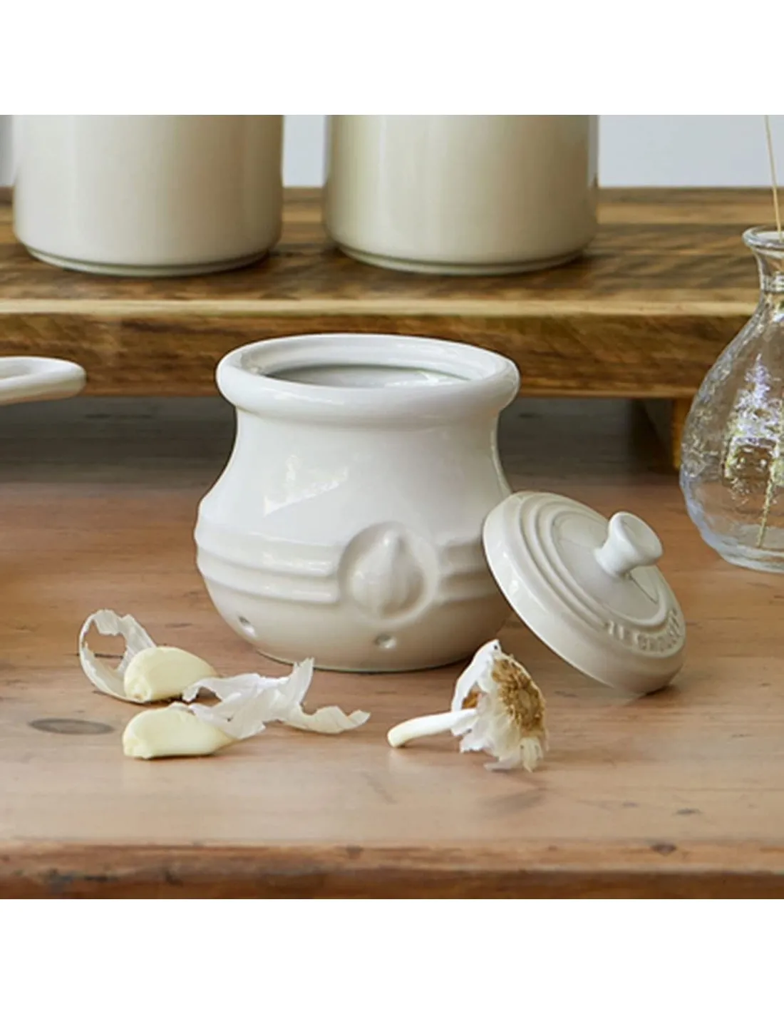 Le Creuset’s stylish Stoneware Preserve Jars will add a splash of colour to your table whether for an indulgent breakfast or a convivial gathering with friends and family. The stylish but practical Garlic Keeper in Almond is designed to provide an ideal environment for storing garlic heads and cloves, this stoneware garlic keeper by Le Creuset makes an attractive and useful addition to any kitchen collection. Holding three to four garlic bulbs at a time it features small vents around the base to keep air inside the jar dry. It also provides a secure-fitting lid with an easy-grip knob that prevents light from entering and odours from escaping. The jar features an embossed decoration on the body. As stylish as practical this jar will add a touch of class to your kitchen and make fabulous gifts to keen cooks enjoying the jam making revolution. Made from Le Creuset’s hardwearing stoneware, all are oven, microwave, grill, freezer and dishwasher safe and come with a 5-year guarantee.