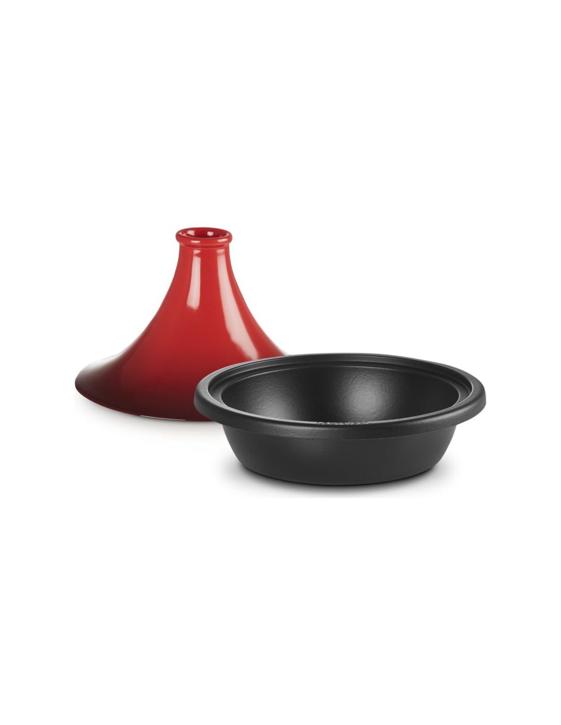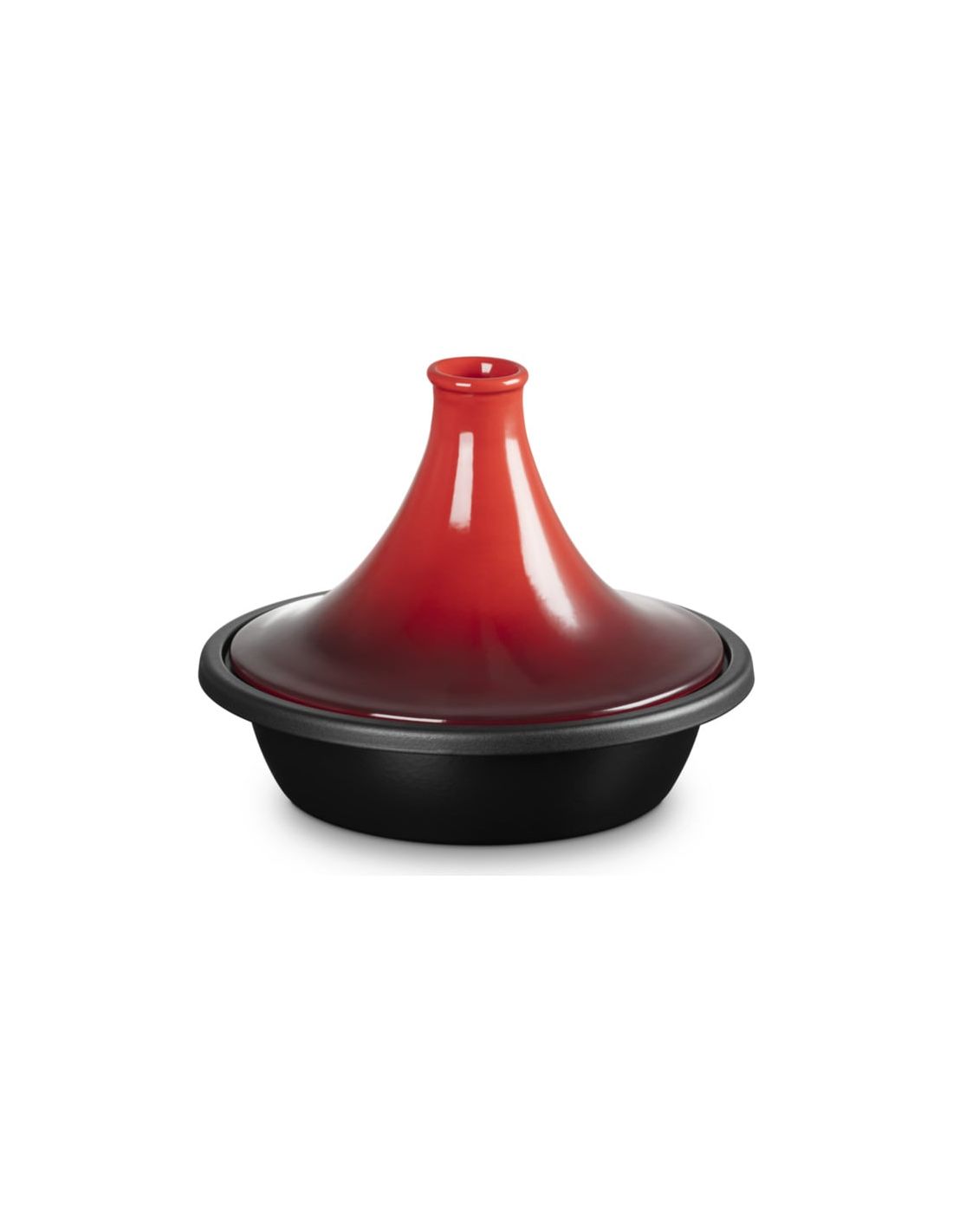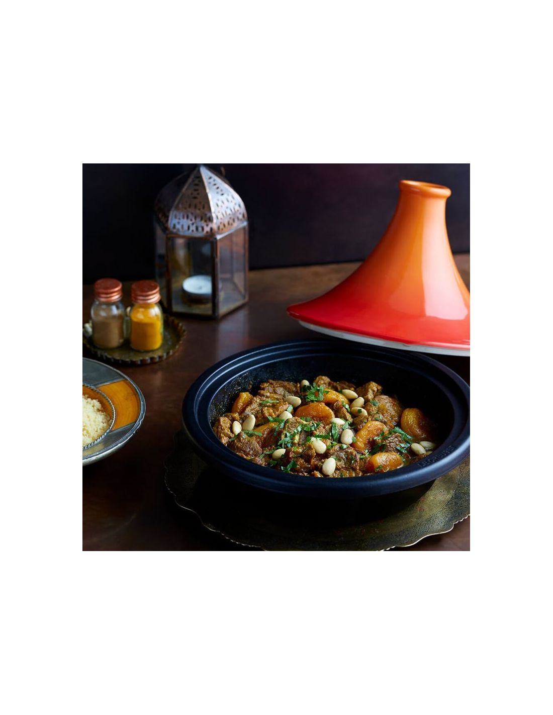 A Tagine is as significant to the cooking of North African food as the wok is to Chinese cuisine and its design is not by accident. Fuel and water are two precious elements in this region and both have to be used frugally. Charcoal fires are almost the only form of “cooking equipment” they have and the wide shallow base of the Tagine can be pushed down among the coals to take full advantage of the heat. The Le Creuset Tagine has been modelled very closely on the traditional design. However, as terracotta is not suitable to use directly on our hobs, the base has been recreated in cast iron. This allows for the very slow and even heat transfer, which a Tagine needs to provide for the food. The conical lid, which is made from glazed Stoneware, allows just the same pattern of re-condensation of the steam, but the glazed finish makes it less porous and therefore cleaner and easier to use.