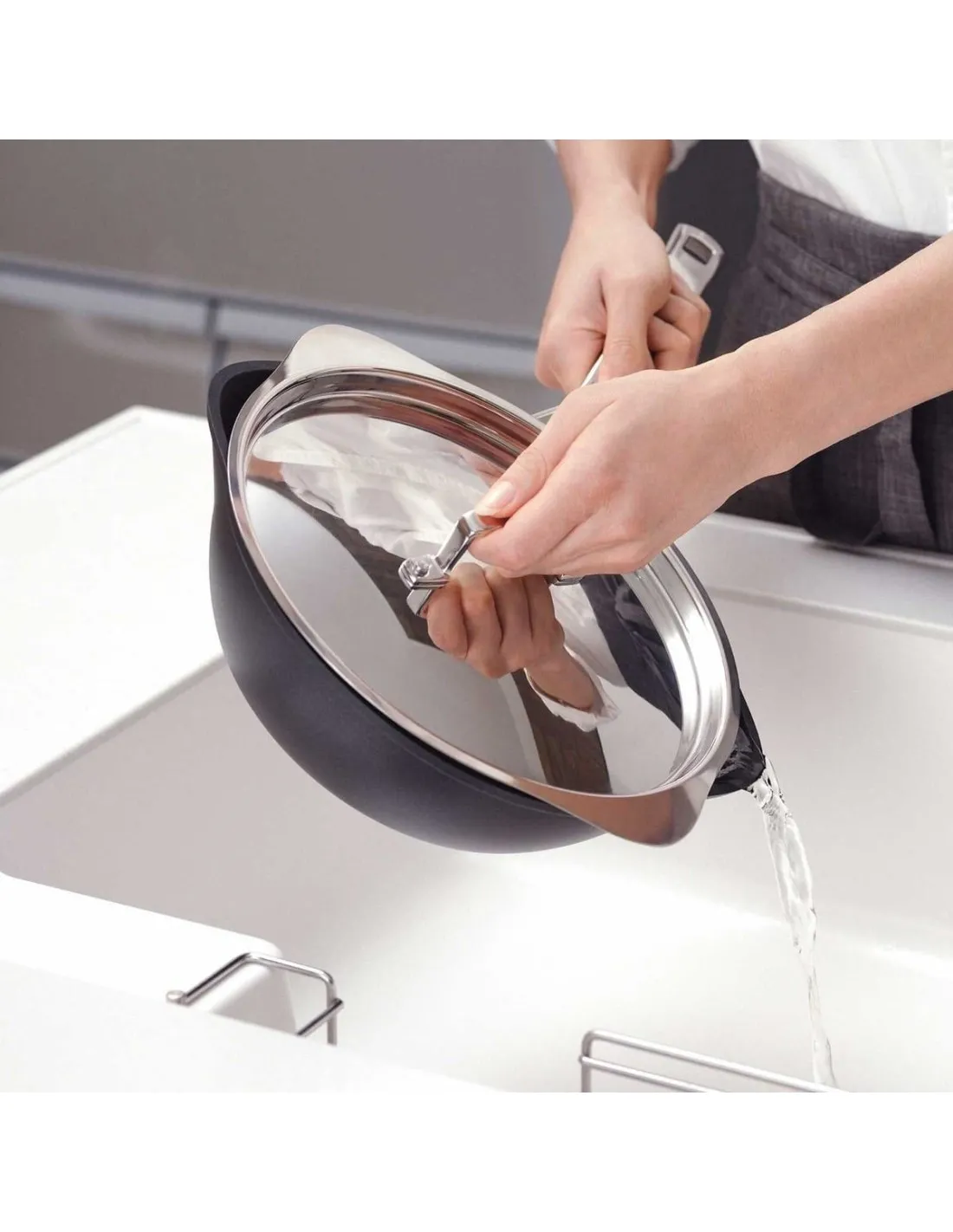 The non-stick Chef's Pan with Pouring Spouts is a versatile brunch-to-dinner solution with easy cleanup. Ideal for a wide range of recipes, including stir-fries, it features two convenient pouring spouts for the easy removal of liquids to achieve crisp results. The 18/10 stainless steel lid is shaped to cover the spouts to retain moisture. If used without the lid, liquids can be quickly reduced into a delicious sauce thanks to the wide, flat base of the pan. High sides and depth prevent splattering or spilling and allow for easy stirring. This durable pan is suitable for use on all hobs, including induction and oven-safe to 260°C.