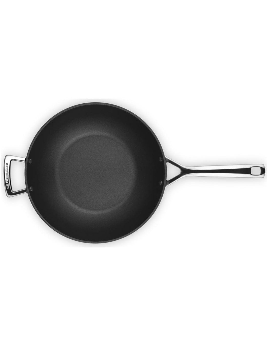 Le Creuset Wok Pan Forged Aluminium.With deep curved sides, the Stir-fry pan is ideal for tempura, stir frying, noodle soups, or making large quantities of ‘one pan’ recipes such as chilli or curry.Toughened Non-Stick is a sleek range of versatile pans perfect for everyday use. It has a tough, PFOA, non-stick surface inside and out, and a special hardened body to create a durable and long-lasting pan that can be used on any heat source. The easy release non-stick interior and exterior surfaces are easy to clean, and are tough enough to withstand use of metal utensils. Professional-style cast handles are attached with stainless steel rivets for a superior, secure fixing, and the addition of a helper handle makes lifting easier. Heat resistant glass lids are available separately. They retain moisture and flavour, and allow you to check the food you are cooking without lifting the lid and disturbing the cooking process or temperature.