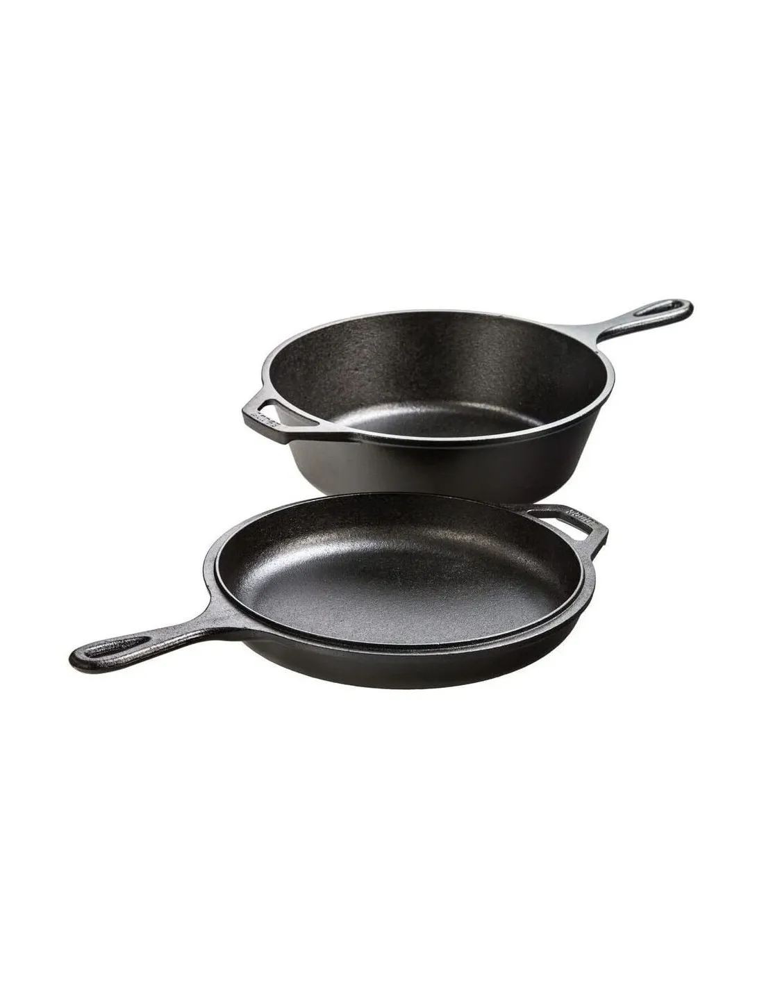 Why choose just one piece of cookware when you can have it all? A Lodge dutch oven, skillet, lid, and deep skillet all in one! Crafted in America with iron and oil, its naturally seasoned cooking surfaces are ready to help you sizzle your way into memorable moments. Seasoned and ready to use.