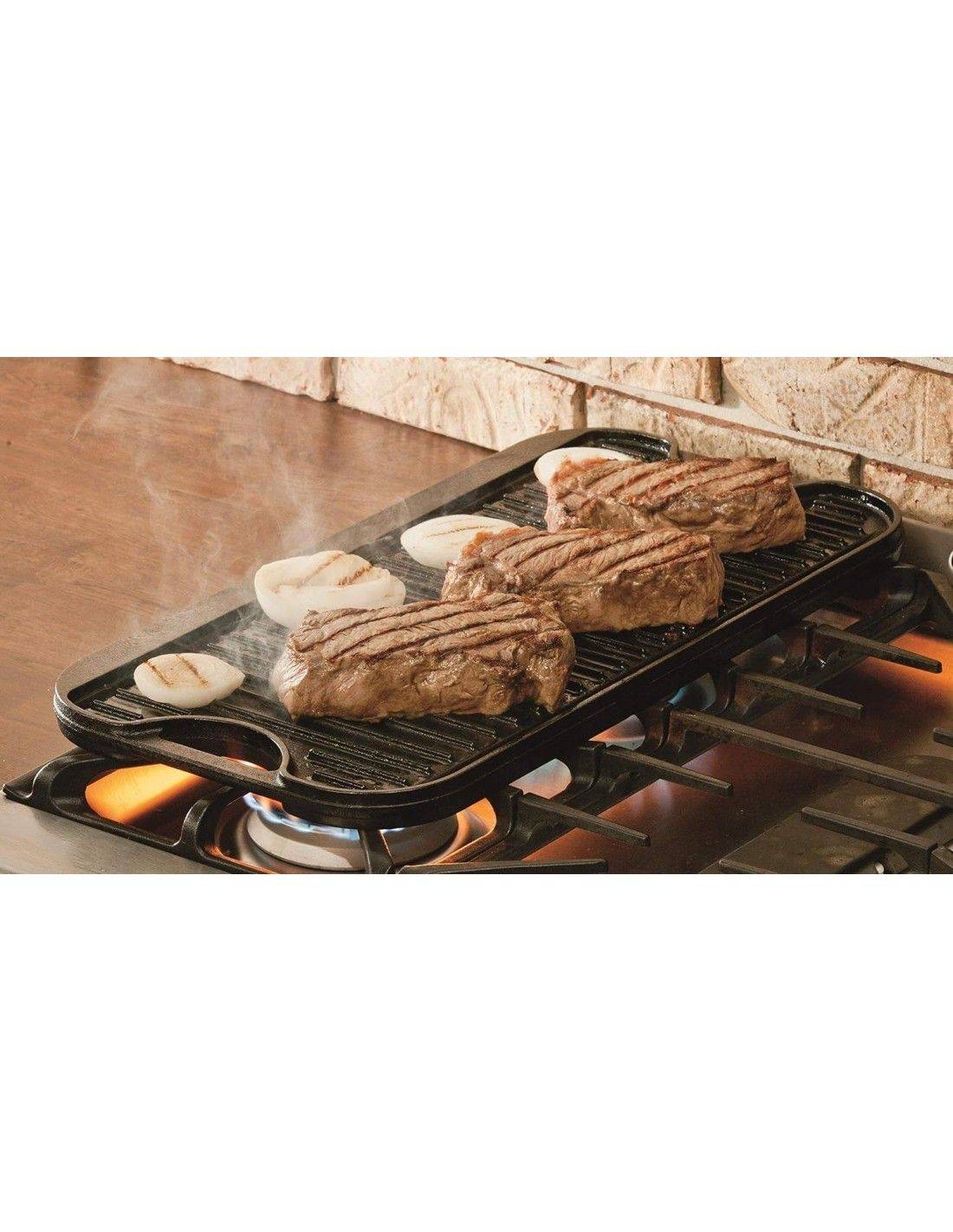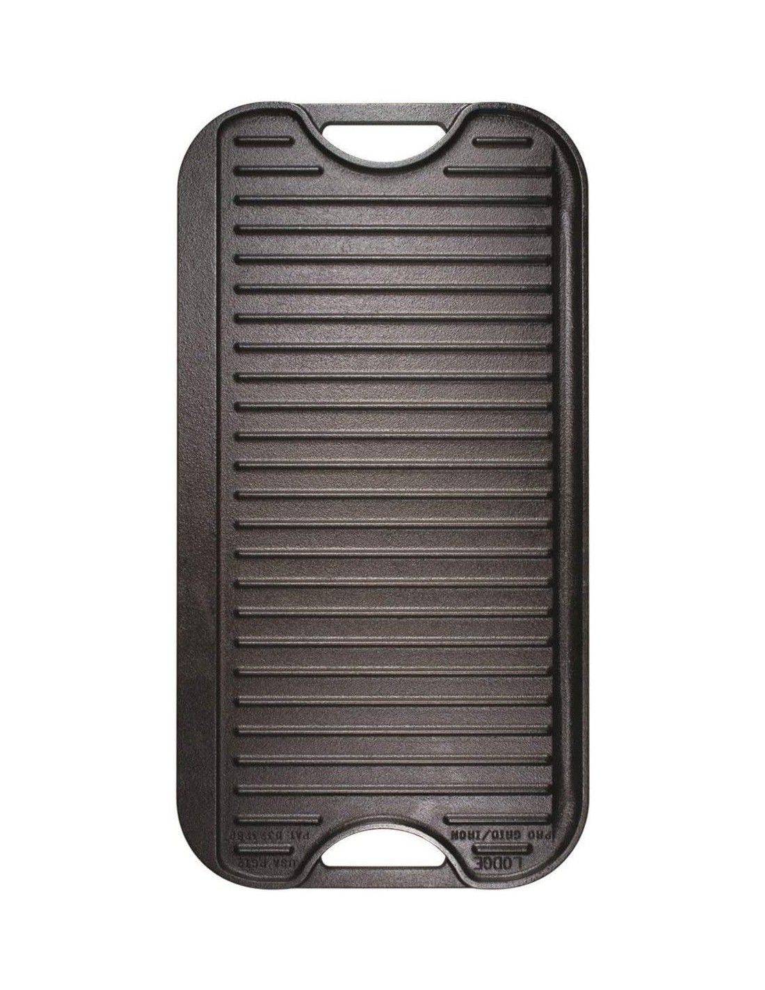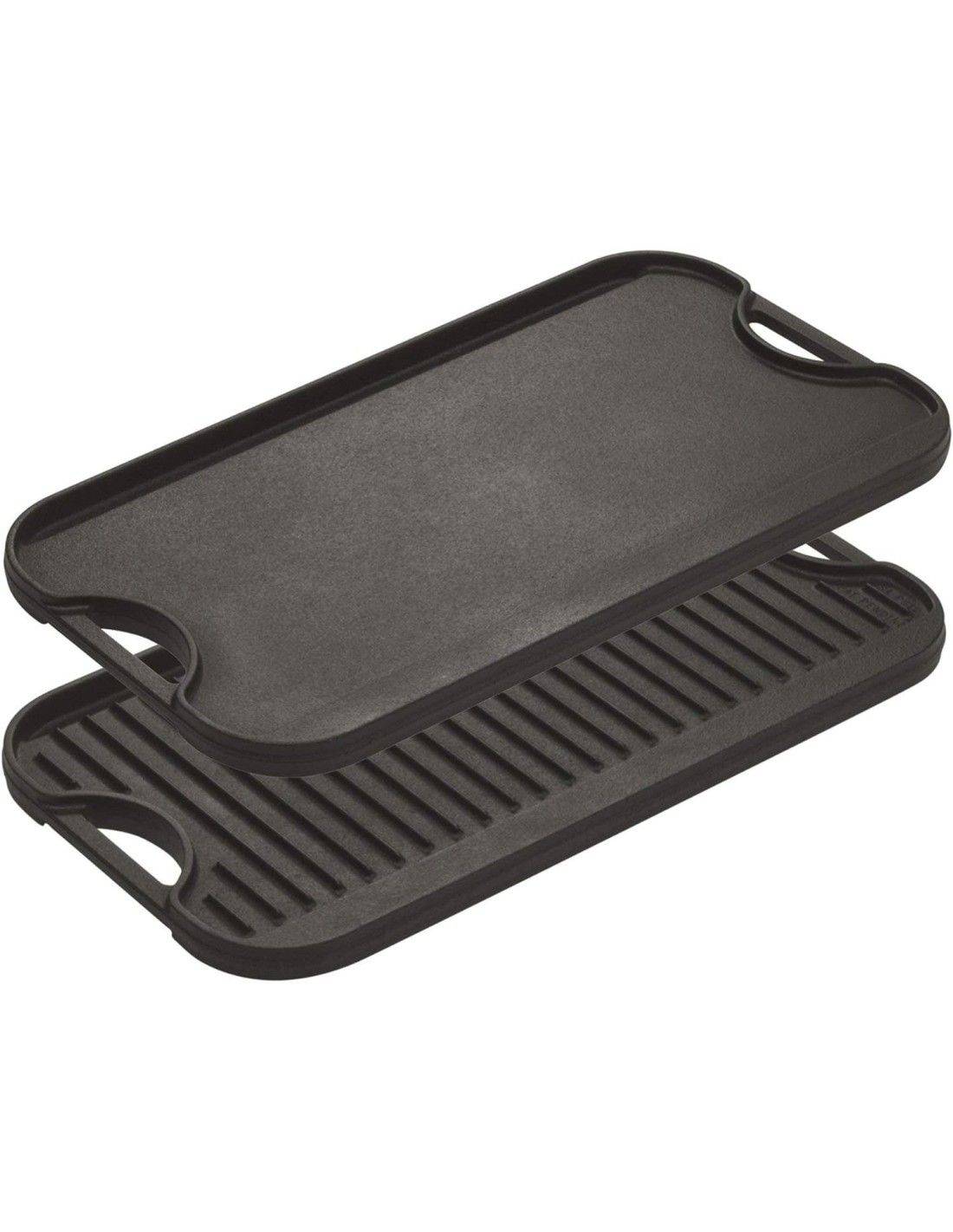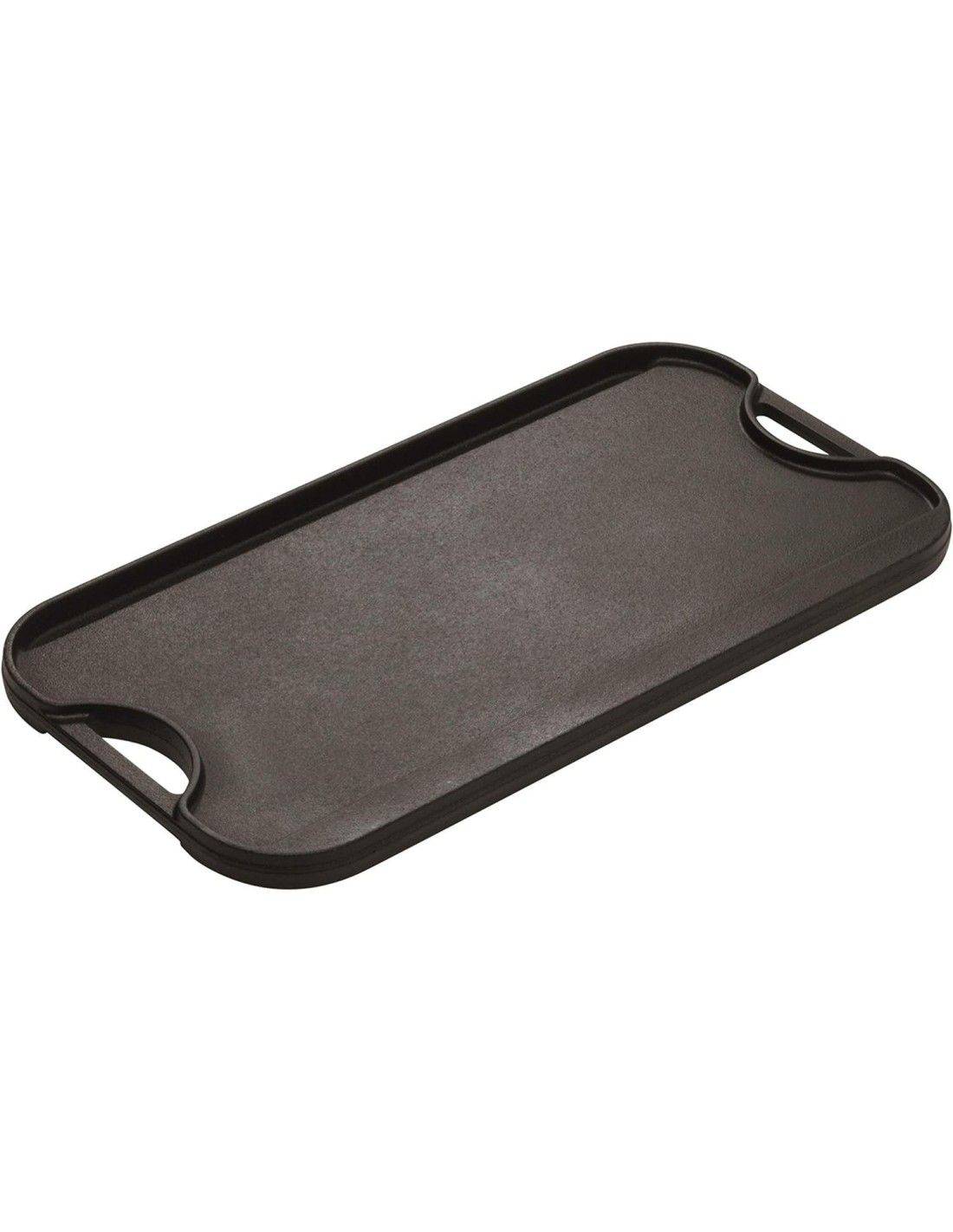The Lodge Pro-Grid reversible cast iron grill/griddle is ideal for cooking larger quantities on the stovetop, in the oven, on the grill or outdoors. One side features a smooth griddle surface that is perfect for pancakes, eggs, bacon, toast and breakfast favourites; the other side has a ribbed grill surface that is ideal for burgers, steaks, sausages, chicken and vegetables with defined grill marks.