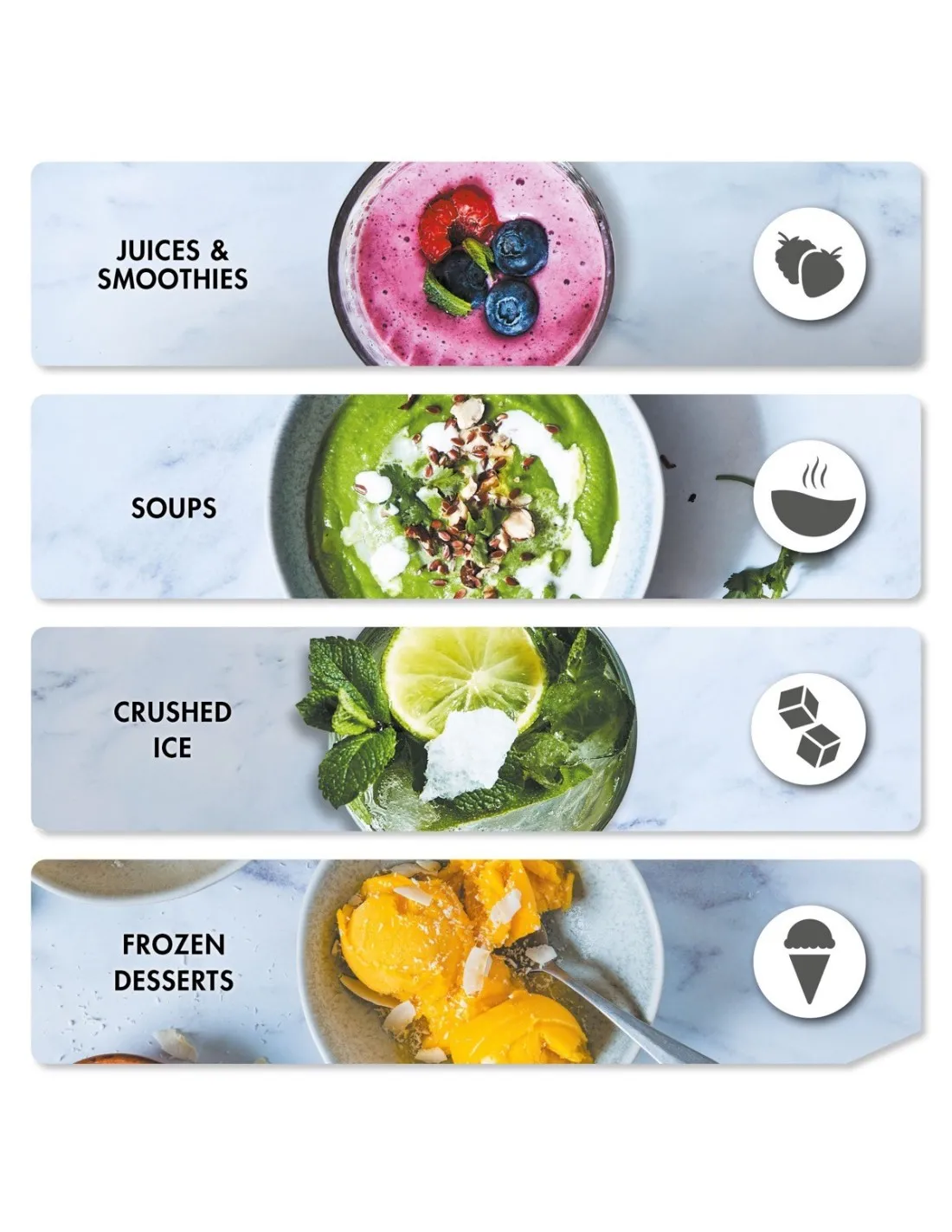• 5 pre-set programmes: Desserts, Ice, Soups, Smoothies & Auto clean
