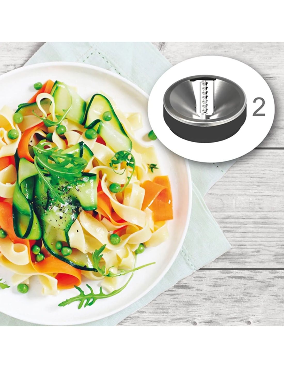 With this accessory, you can easily prepare vegetable spaghetti, tagliatelle, and fusilli. The 3 stainless steel cones create different cut styles, helping bring more variety and presentation to your dishes. The 60mm XL feed tube and included accessories make everyday use simple and practical.