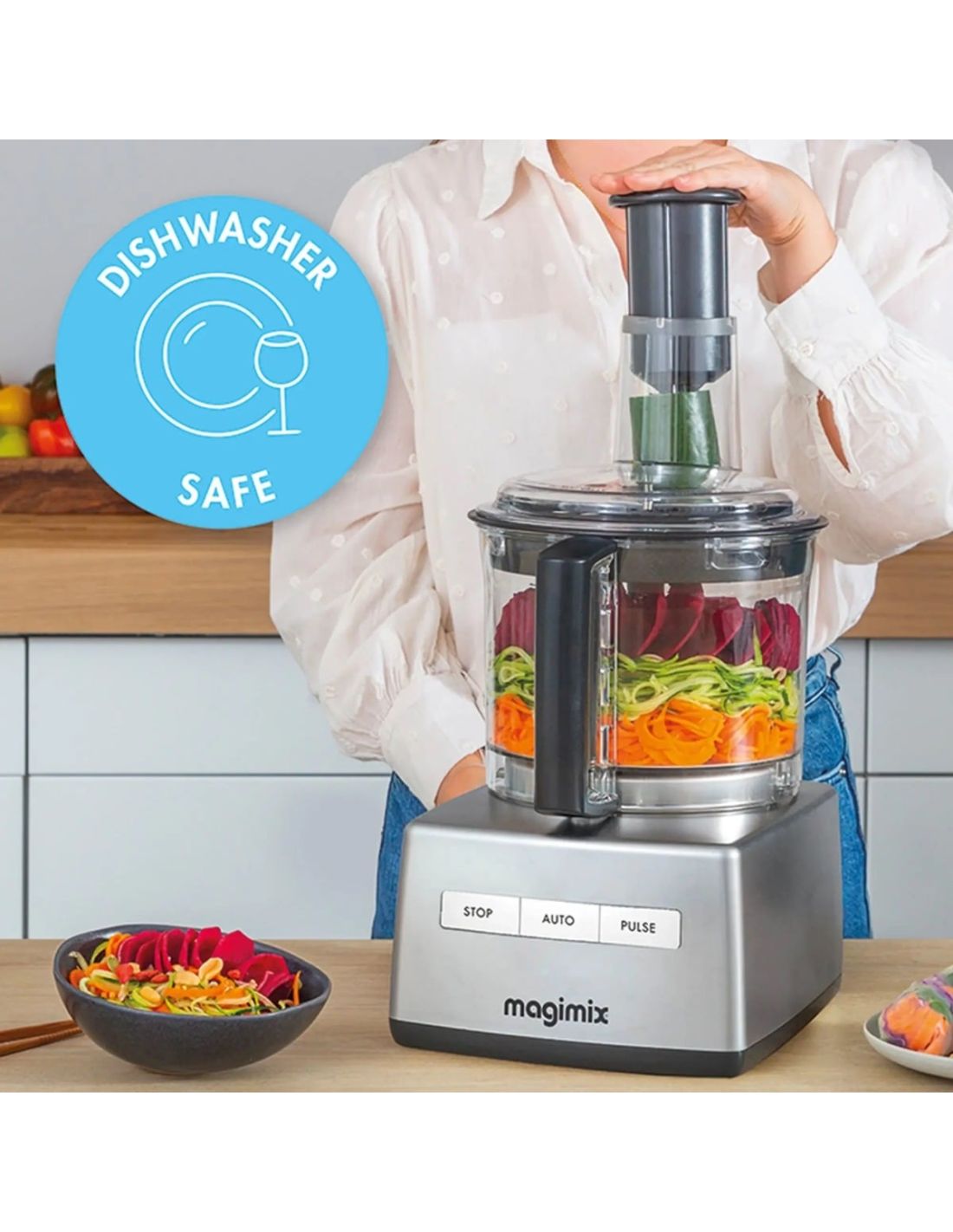 Compact and easy to store, the Spiral Expert is designed for convenient everyday use. The cones and extender can be stored inside the support, and all parts clean quickly and are dishwasher safe. It also includes a booklet with recipe ideas and access to the Magimix app to explore new preparations.