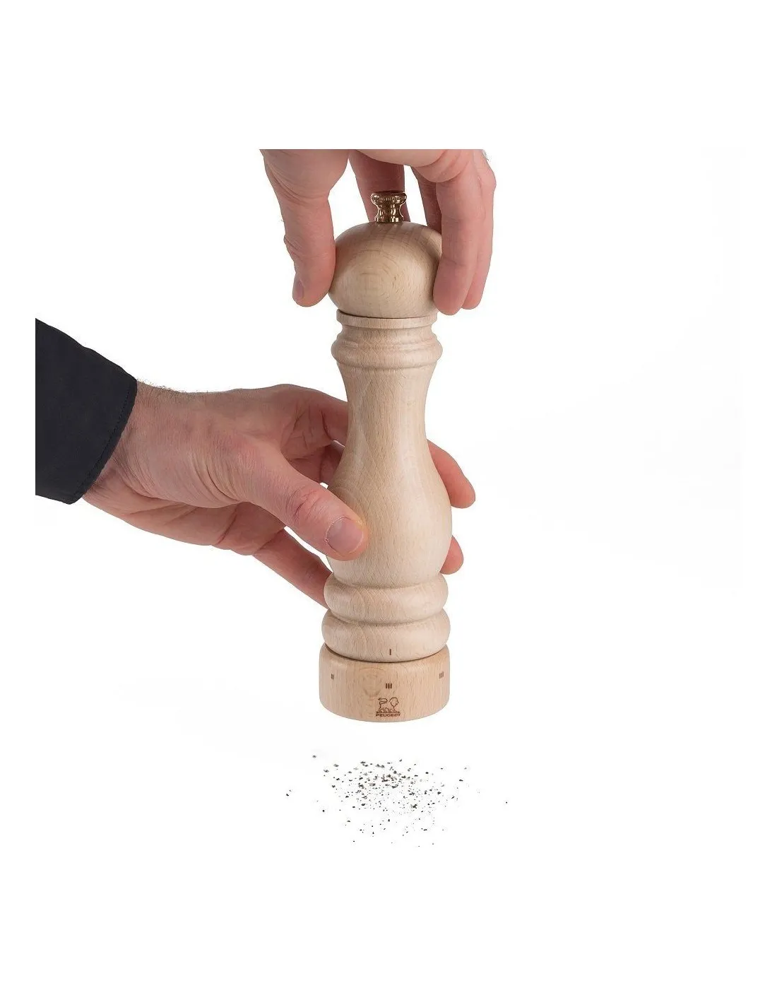 Peugeot Paris Pepper Mill u-select.The PEUGEOT Paris mill collection is the brands signature. With classical and timeless lines, Paris is fast becoming the most preferred mill. It is suitable in modern and more traditional kitchens. The round shape of this mill allows for a great grasp and easy rotation of the head while cooking. The PEUGEOT mechanism has a lifetime limited guarantee,5 years on the body of the mill. PEUGEOT Pepper Grinding Mechanism is a two stage burr-style system. During production, the helix-shaped grooves and grinding teeth of the pepper mechanism are individually cut before the steel is case hardened to make it virtually indestructible. The mechanism is then given a proprietary treatment to provide additional protection against corrosion. During use, the helix- shaped grooves guide whole peppercorns through the mechanism to crack, then grind to a consistent size by a double row of teeth. This process releases the pepper's essential oils, resulting in more flavor and aroma for your dish. This patented mechanism is found on every PEUGEOT Pepper mill and is widely considered the best pepper mechanism. The Paris Mill has been elected n1 kitchen essential by Real Simple in May 2013. PEUGEOT mills: often copied, never Equaled. Since 1810.