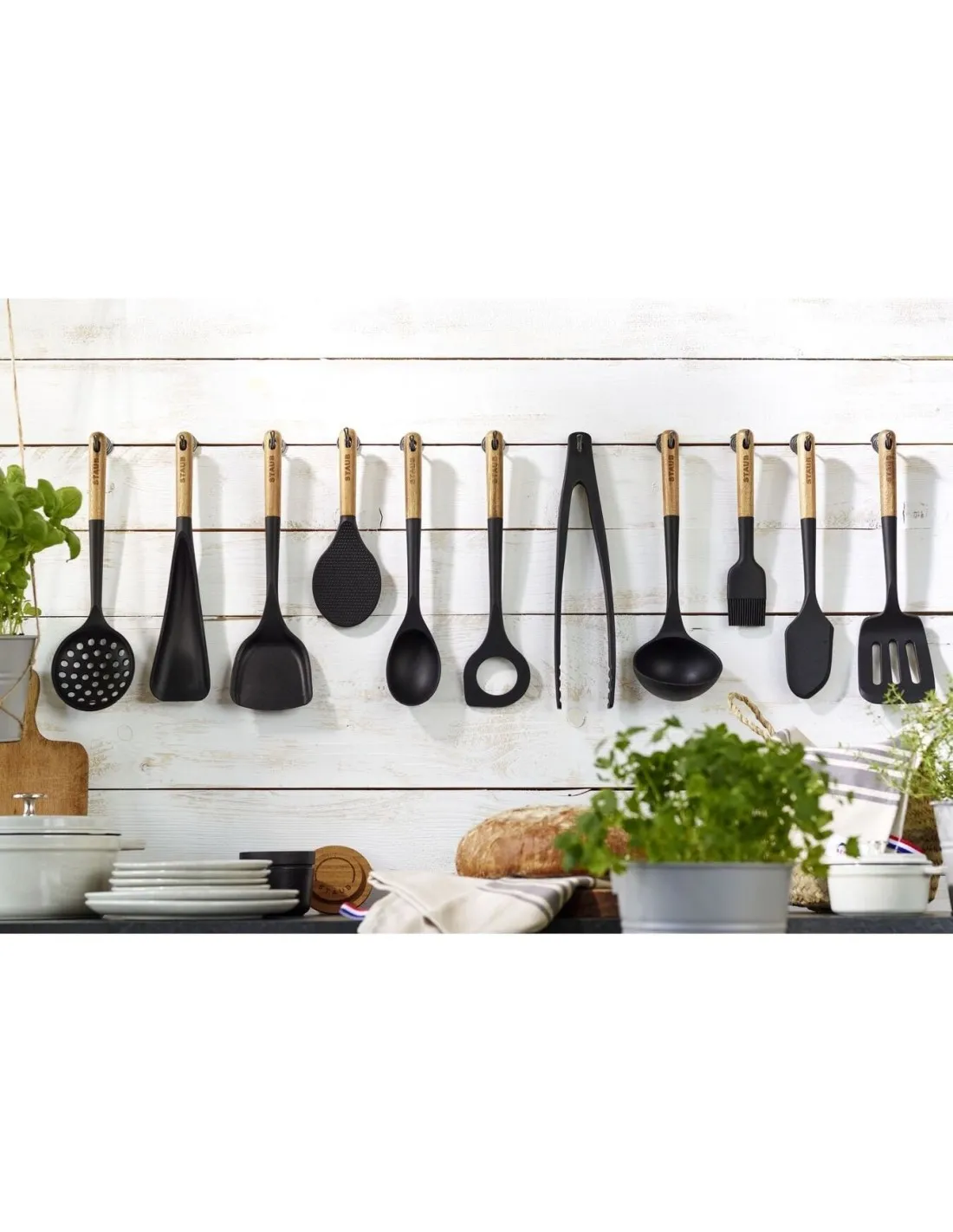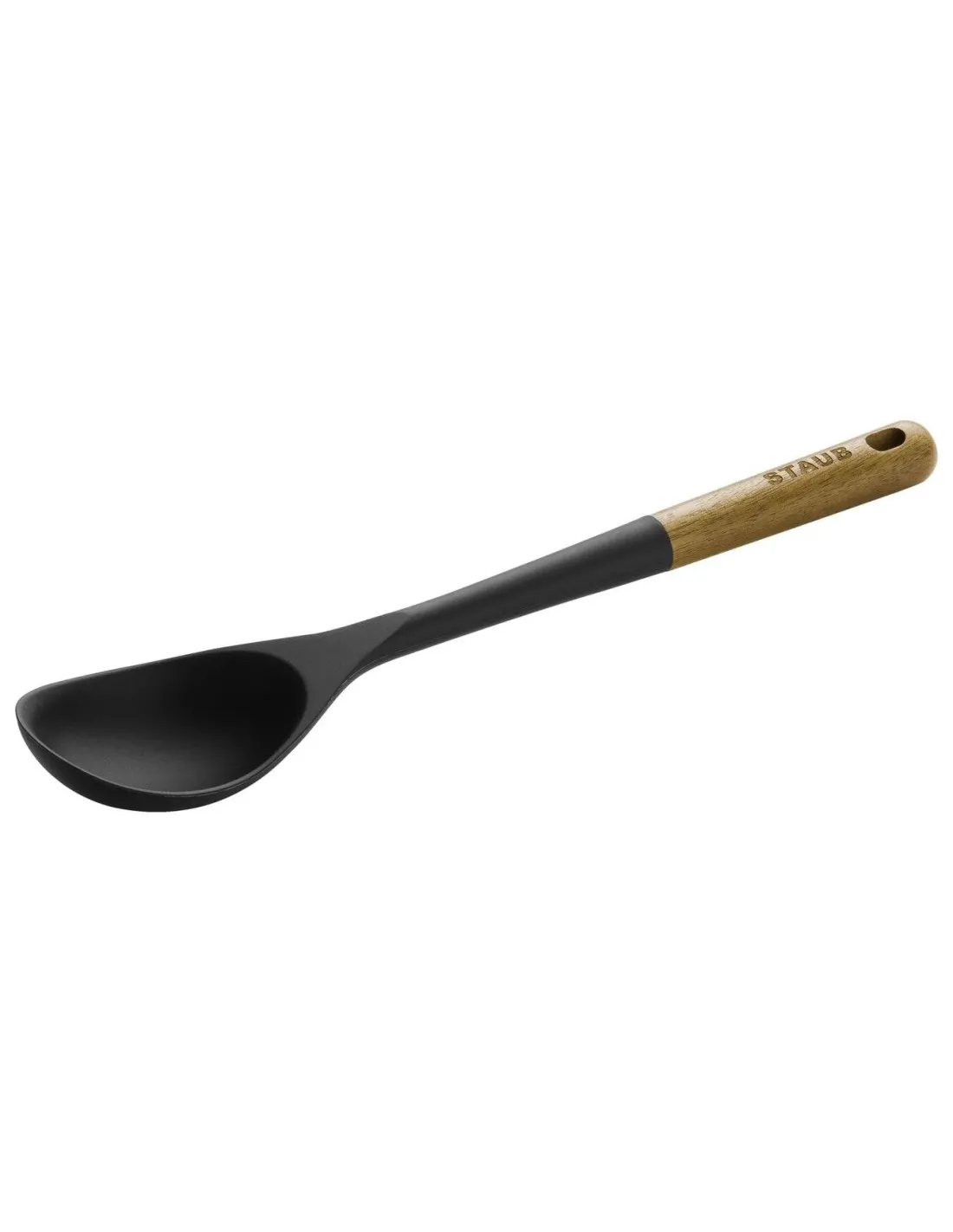 With the new series of utensils, STAUB completes its range of cookware. The design is ergonomic and functional and at the same time beautiful, making the utensils a harmonious match for other STAUB products in the kitchen and on the table. The handle is made from acacia wood and long enough to protect from hot liquid, while the main part of the serving spoon consists of black matte silicone. This high-quality material is suitable for all surfaces, including non-stick coatings and enamelled cast iron, and is extremely durable and heat resistant. The serving spoon fits a variety of purposes. It can be used to serve individual portions of food at the table right from our Cocottes or ceramic oven dishes, but also to stir and turn ingredients while cooking. Its egg shaped bowl is ideal for scooping portions of vegetables or casseroles.