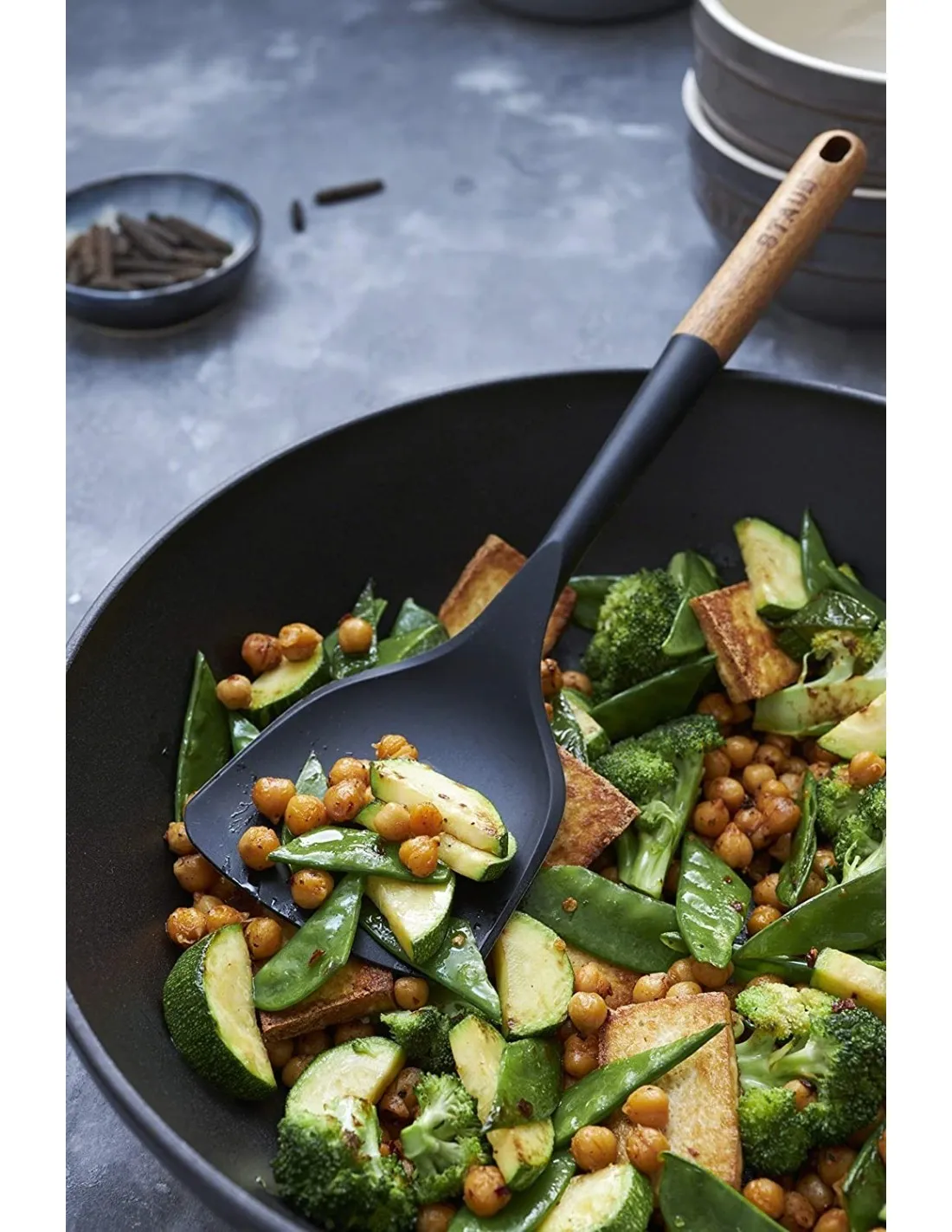 Staub 31 cm silicone turner. Have you ever wondered why risotto spoons have a hole in the head piece? It allows the rice to move through while you stir, rubbing grains and making the risotto creamy and smooth. The asymmetrical shape of the spoon is not just a design feature either. The pointy tip allows you to reach all the way into the corners of la Cocotte, making sure you stir every grain of rice in your risotto to create a perfect dish. The risotto spoon can be used for a variety of other dishes, too. It works wonderfully with polenta, rich sauces and of course other rice dishes like paella and one-pot curries. Being part of the new STAUB utensils range, the risotto spoon is made of high-quality material for best results.