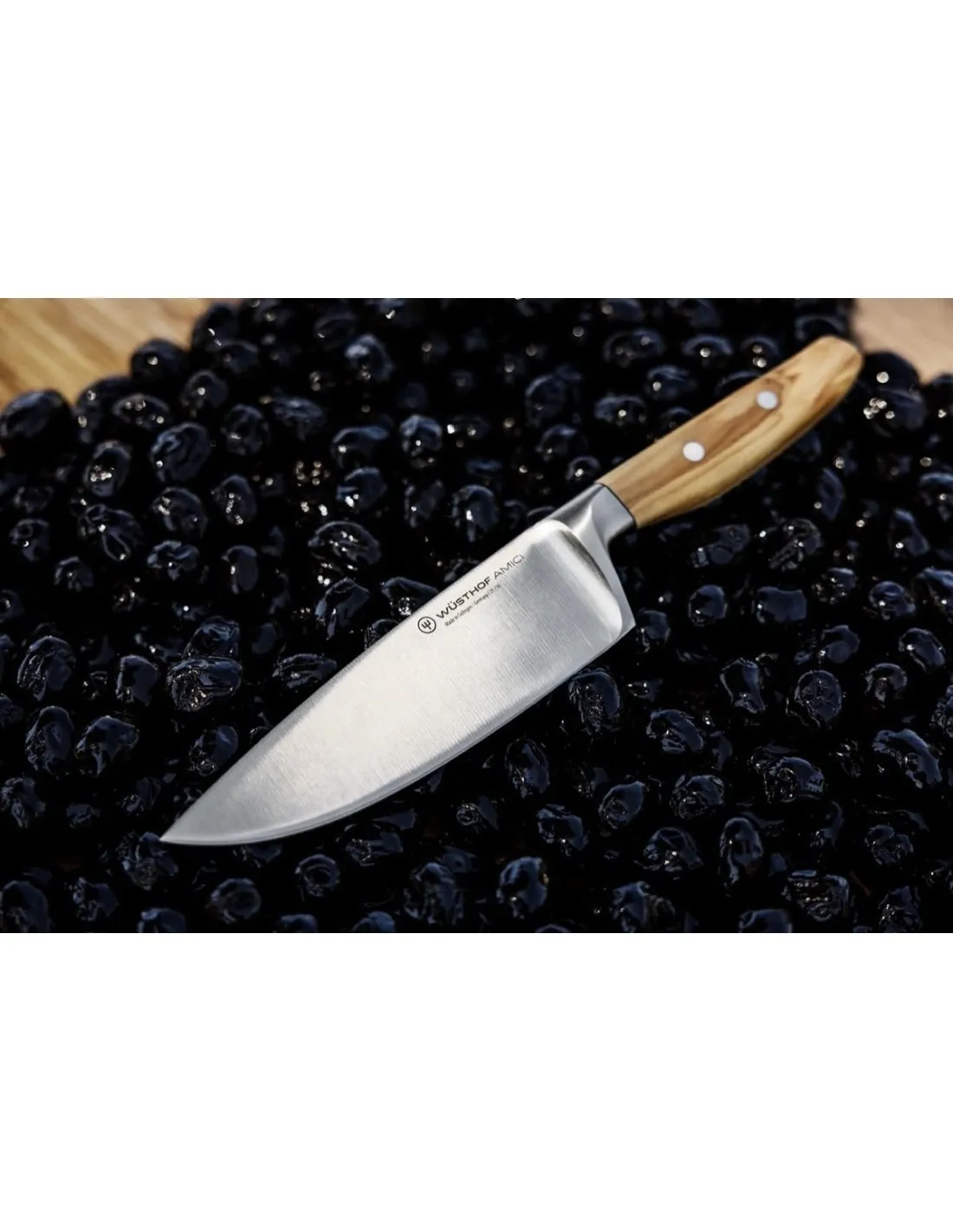 The all-rounder in the kitchen: the most important piece of basic equipment for every hobby and professional chef, the Cook’s 16cm Knife is suitable for most tasks in the kitchen, for the widest variety of cutting and gripping techniques, it makes food prepping a pleasure.Inspired by memories of family and friends gathering al fresco in the countryside, WÜSTHOF Amici celebrates a simpler life. It is a life connected to nature, love of good food, and affection for all we invite to the table. The sculpted forged blade is paired with a uniquely variegated olive wood handle — no two are the same. Amici brings together a gracious Mediterranean lifestyle and old-world craftsmanship, creating a soulful reminder to cherish life‘s precious moments.