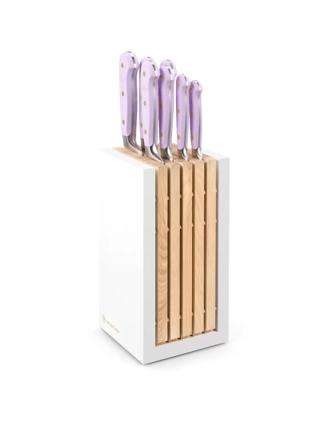 Picture this: you walk into your kitchen to prepare your favourite meal. On the counter sits a beautiful knife block filled with every cutlery companion you might need for a kitchen task. But these are no ordinary culinary tools — each blade is paired with a vibrant handle that adds a subtle pop of colour and style to your everyday life. Choose between five unique handle colours (inspired by the culinary world!). No matter how you slice it, these knives will infuse your food prep with an extra dash of joy and personality. What’s not to love about that?Enjoy your new knife block filled with WÜSTHOF Classic knives, combined with a dose of colour to complement your lifestyle and your kitchen. This designer knife block with inserts of oiled ash is a stylish joy. The Knife Block includes: Classic Paring Knife 9 cm Classic Serrated Utility Knife 14 cm Classic Utility Knife 16 cm Classic Chef's Knife 16 cm Classic Santoku with Hollow Edge 17 cm Classic Chef's Knife 20 cm Classic Double-Serrated Bread Knife 23 cm