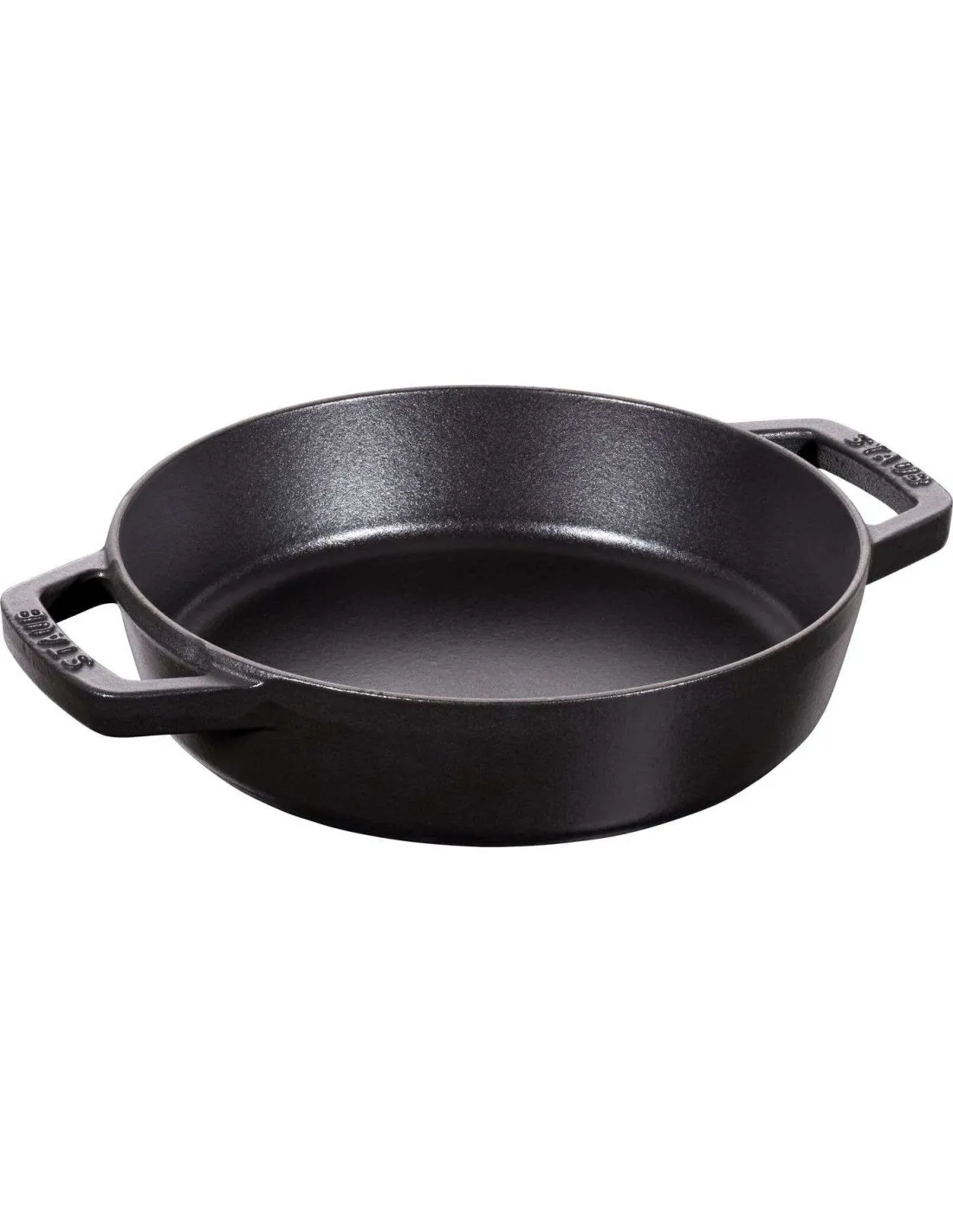Dore, selle, cocine a fuego lento o saltee de forma profesional con esta paellera Staub de doble asa. El esmalte negro mate de la base evita que la comida se adhiera y permite cocinar con menos grasa. Es ideal para guisar lentamente en el horno o en la cocina, conservando todos los nutrientes y vitaminas de los alimentos. El recubrimiento liso de la sartén se lava rápida y fácilmente. Esta paella es apta para todo tipo de superficies de cocción, incluso placas de inducción. Lleve esta paellera de color gris grafito de la cocina al comedor, es ideal para servir directamente los platos. Su atractivo diseño dará un toque de distinción a la mesa, donde combina con cualquier estilo de decoración: una velada romántica a la luz de las velas o para servir una guarnición en una cena familiar. El diseño de esta sartén de 20 cm se basa en la paella española. Esta serie se compone de diferentes productos que combinan perfectamente entre ellos. Sorprenda a sus invitados con deliciosos arroces, verduras, carne, pescado o marisco. Gracias a las excelentes cualidades de la batería de cocina Staub: una óptima retención y conducción del calor, los alimentos se cuecen a la perfección. Elabore cómodamente en esta sartén recetas de todo el mundo.