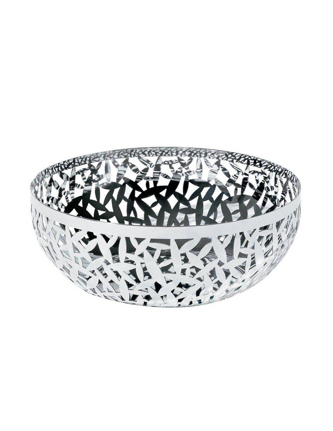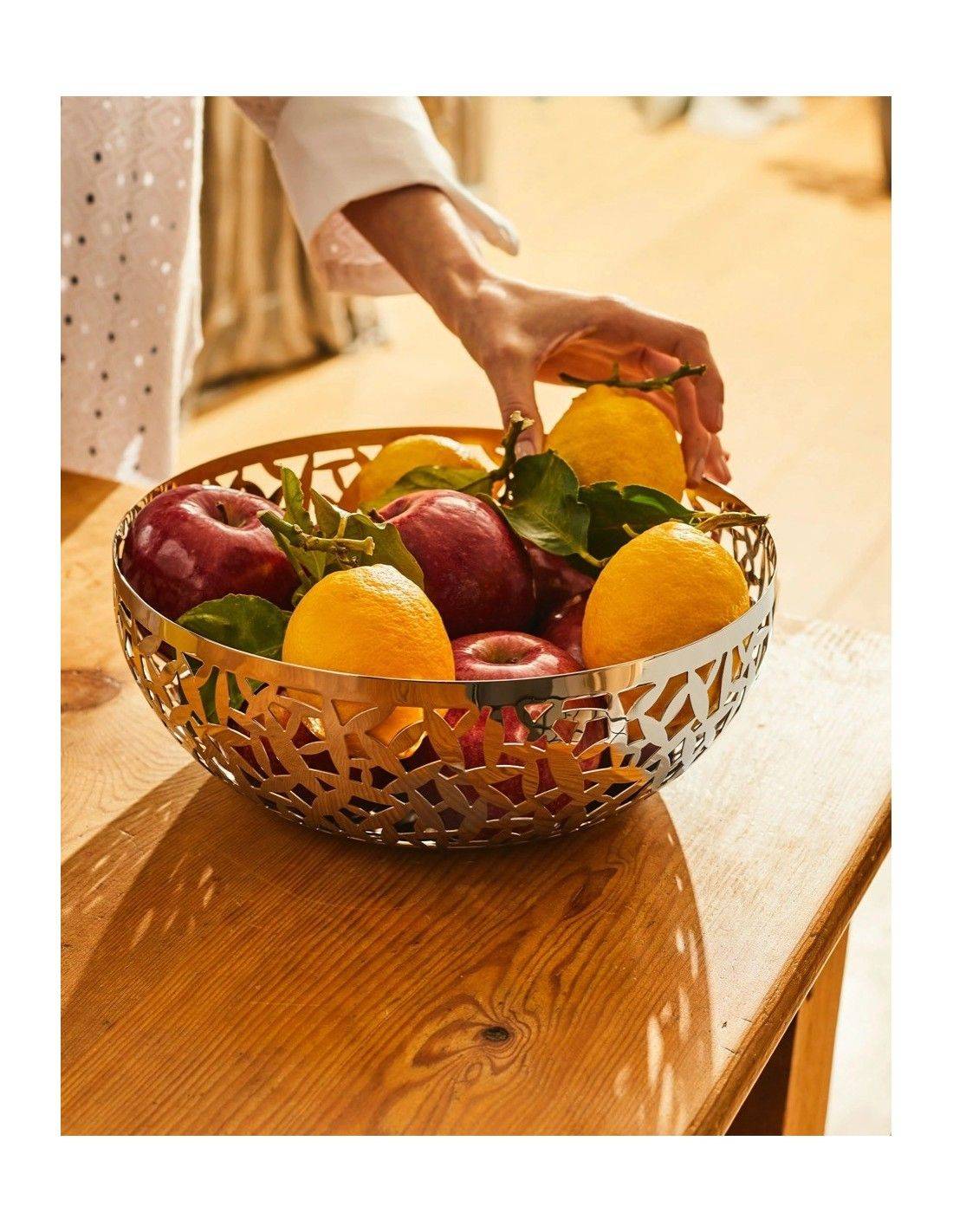 Fabricado en acero inoxidable 18/10, presenta una construcción resistente y un acabado brillante que realza su diseño recortado. La estructura abierta favorece la ventilación natural de la fruta y crea una presentación ligera y sofisticada, adecuada tanto para interiores contemporáneos como para cocinas más clásicas.
