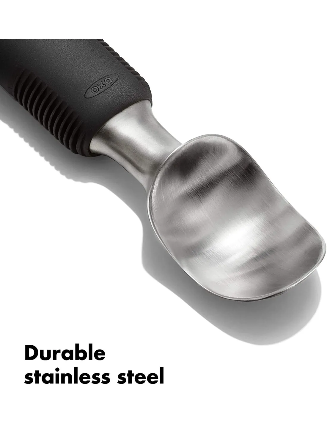 La cuchara de helado de acero inoxidable de OXO calidad. La cuchara tiene un protector de mango que evita que su mano se deslice mientras retira el helado. El mango es suave y antideslizante y alivia la presión sobre la mano.