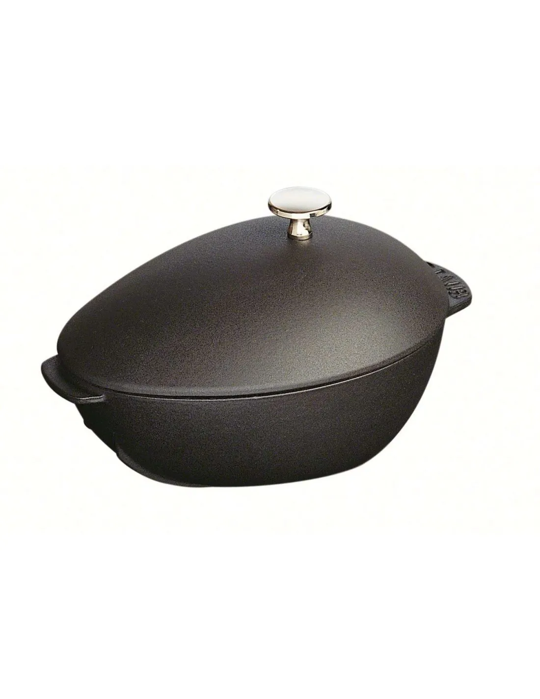 Los platos de mejillones no sólo se degustan bien cuando se está de vacaciones, pongamos por ejemplo, en la terraza de un restaurante de un puerto mediterráneo; los puede también preparar en su propia cocina. La cacerola ovalada para mejillones Staub de color negro está especialmente ideada para elaborar platos de mejillones y es también un atractivo recipiente para servir dos o tres raciones de mejillones. Esta cacerola de la marca Staub es de hierro colado, material que garantiza que los mejillones se mantendrán calientes una vez en la mesa. El calor se distribuye uniformemente durante la cocción. Este recipiente mide 25 cm de largo, 17,8 cm de ancho, 16,9 cm de alto con la tapa y tiene una capacidad de 2 litros. Una rejilla separa una pequeña zona en la que añadir especias y salsas. La rejilla de acero inoxidable mantiene fijos los mejillones mientras se vierte la salsa. Colocada sobre la mesa, el interior de la tapa resulta muy útil para recoger las conchas vacías de los mejillones. Esta cacerola tiene forma de mejillón. Sirva a sus huéspedes deliciosos platos en un elegante recipiente de hierro colado diseñado especialmente para preparar mejillones.