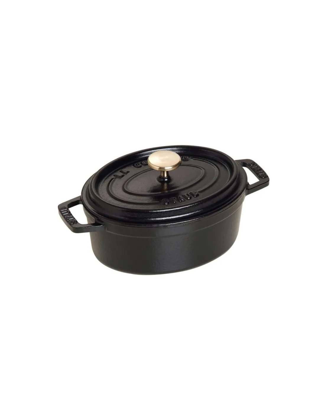 La Cocotte ovalada con sus dos asas es ideal para preparar guisos de todo tipo. Está hecha de hierro fundido, que retiene de manera óptima de calor y lo distribuye por toda la superficie inferior y laterales. Así, carne y otros alimentos se cocinan de manera uniforme y, al mismo tiempo suave. Al cocinar lentamente, los alimentos conservan todo su sabor y lo desarrollan plenamente, dando un toque único a sus platos. Las Cocottes de staub están recubiertas en su interior con un esmalte negro mate. Este revestimiento mejora las propiedades del hierro fundido, robusto, duradero y fácil de limpiar. La cazuela de hierro fundido es mejor cuanto más se utiliza. En su exterior, el esmalte color gris grafito de la Cocotte le da un atractivo y llamativo diseño. Por lo tanto, se puede presentar cualquier plato con estilo en esta cazuela tras ser preparado. La Cocotte va bien con cualquier plato y le da a su cocina un toque francés. La Cocotte de STAUB es adecuada para cualquier fuente de calor, incluso para placas de inducción. La Cocotte tiene un diámetro de 15 cm y una capacidad de 0,6 l. La anchura incluyendo las asas es de unos 19 cm. En esta cazuela podrá preparar muchos platos deliciosos y saludables con los que sorprender a su familia o sus amigos una y otra vez.