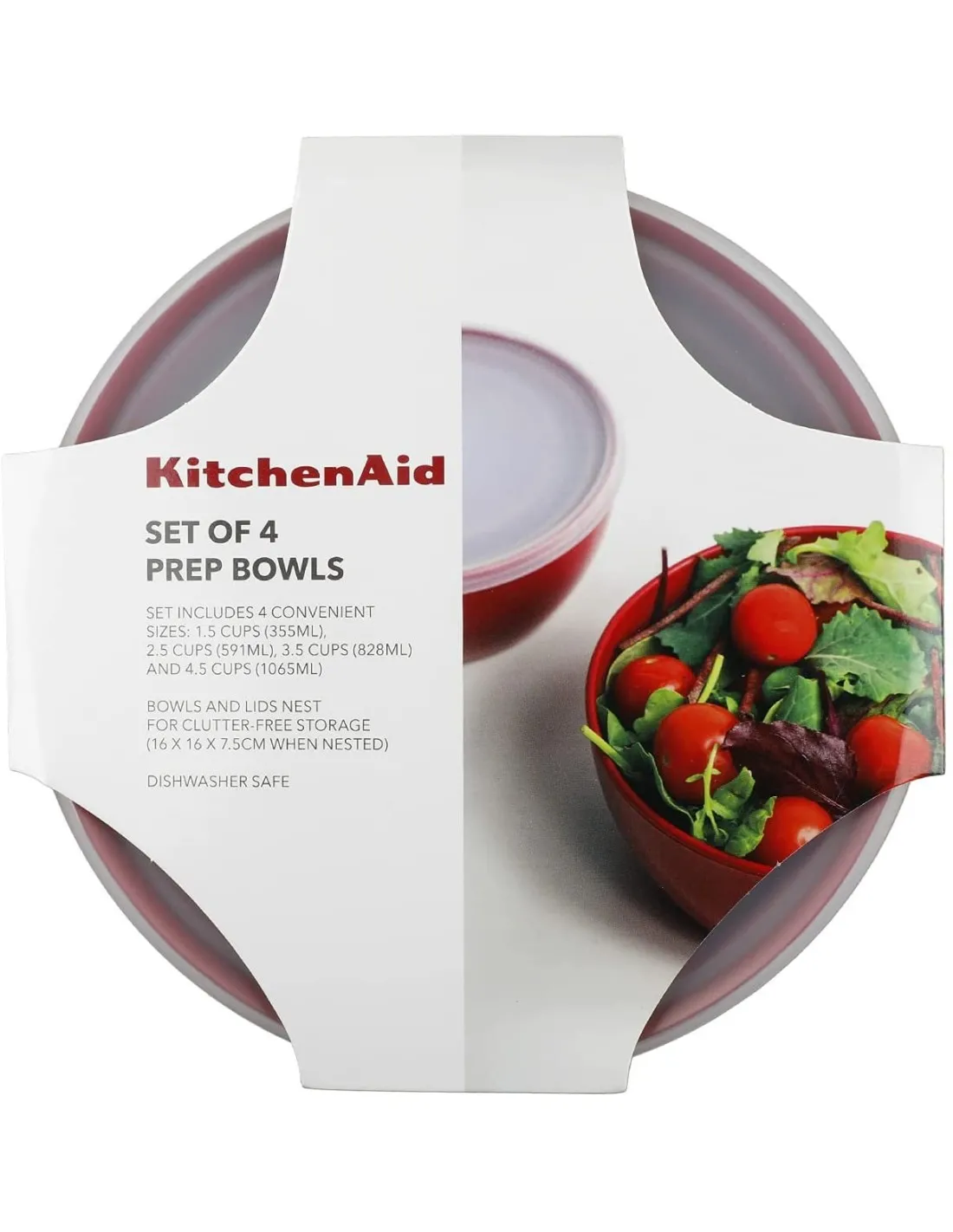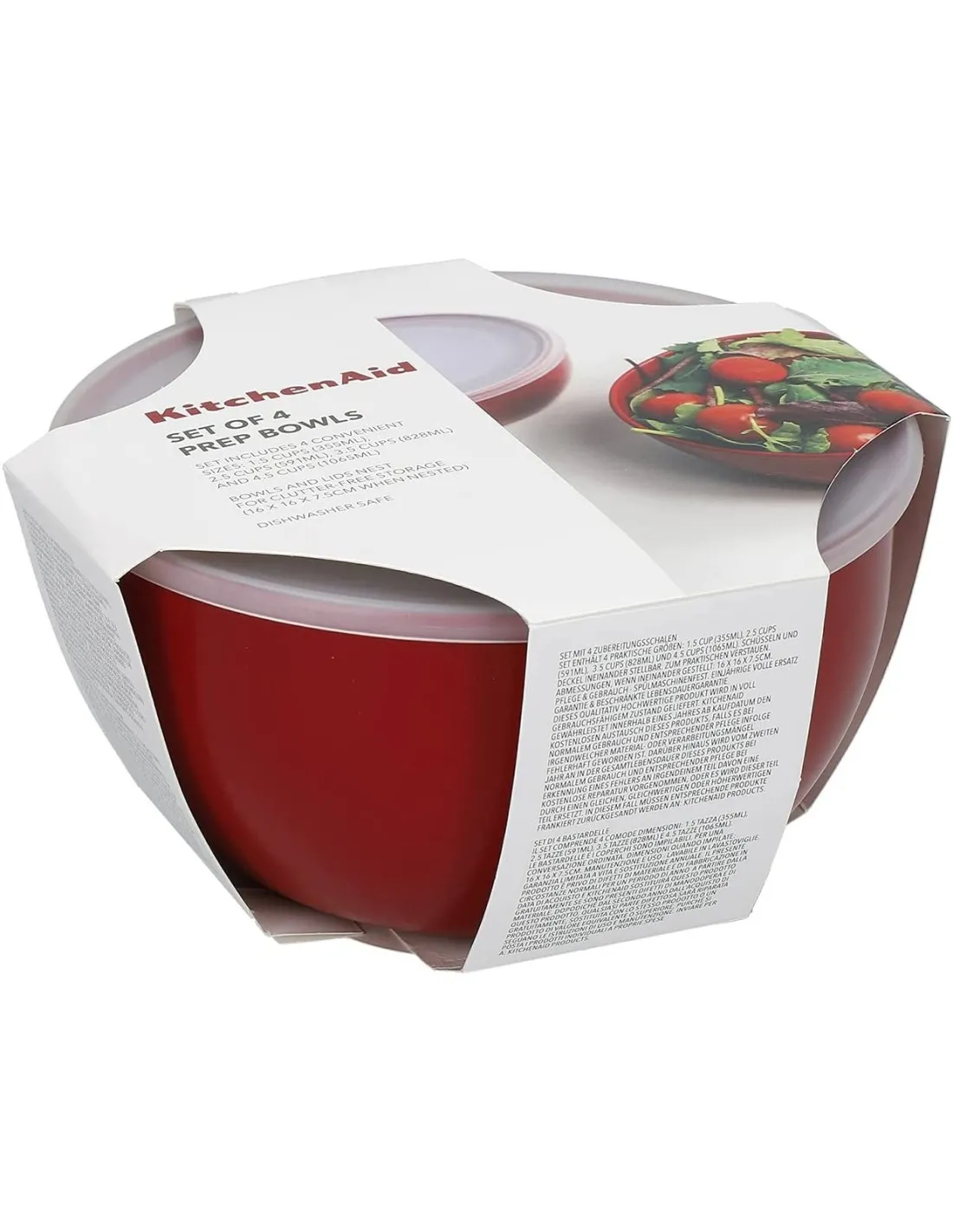 El juego de 4 tazones de KitchenAid es un conjunto de 4 recipientes de plástico con tapas, diseñados para ayudarte a preparar y conservar tus recetas y que puedes almacenar dentro de cada uno, organizados y ocupando muy poco espacio. El conjunto consta de 4 cuencos rojos y una tapa blanca translúcida, que garantiza un cierre hermético y estanco para una perfecta conservación. Perfecto para el uso diario, su capacidad, indicada sobre la base de cada uno, es: - 355 ml (1.5 taza). Medidas: 11,8 cm x 5 cm.- 591 ml (2,5 taza). Medidas: 13,1 cm x 6,7 cm (alto).- 828 ml (3,5 taza). Medidas: 14,5 cm x 7,5 cm (alto).- 1.065 l (4,5 taza). Medidas: 15,5 cm x 8 cm (alto).
