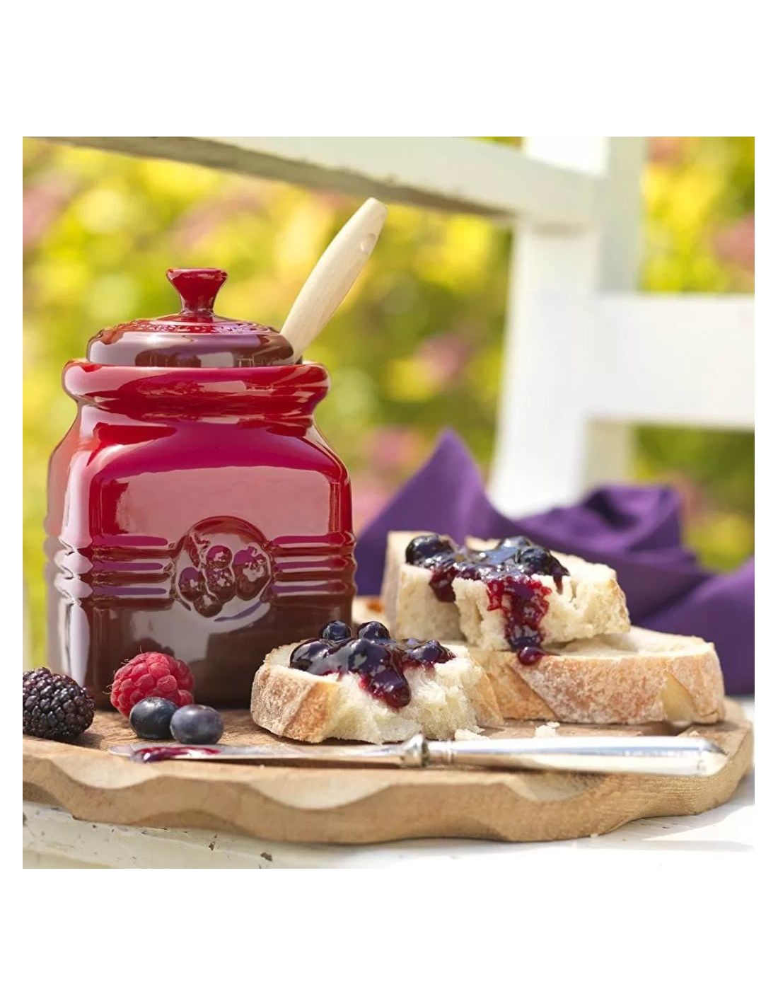 Está hecho en resistente cerámica de gres que la marca francesa Le Creuset utiliza en muchos de sus utensilios de cocina, como su bote de miel, bote para espátulas o el reposa cucharas. Además de resistente a los golpes, es muy fácil de lavar en el lavavajillas.