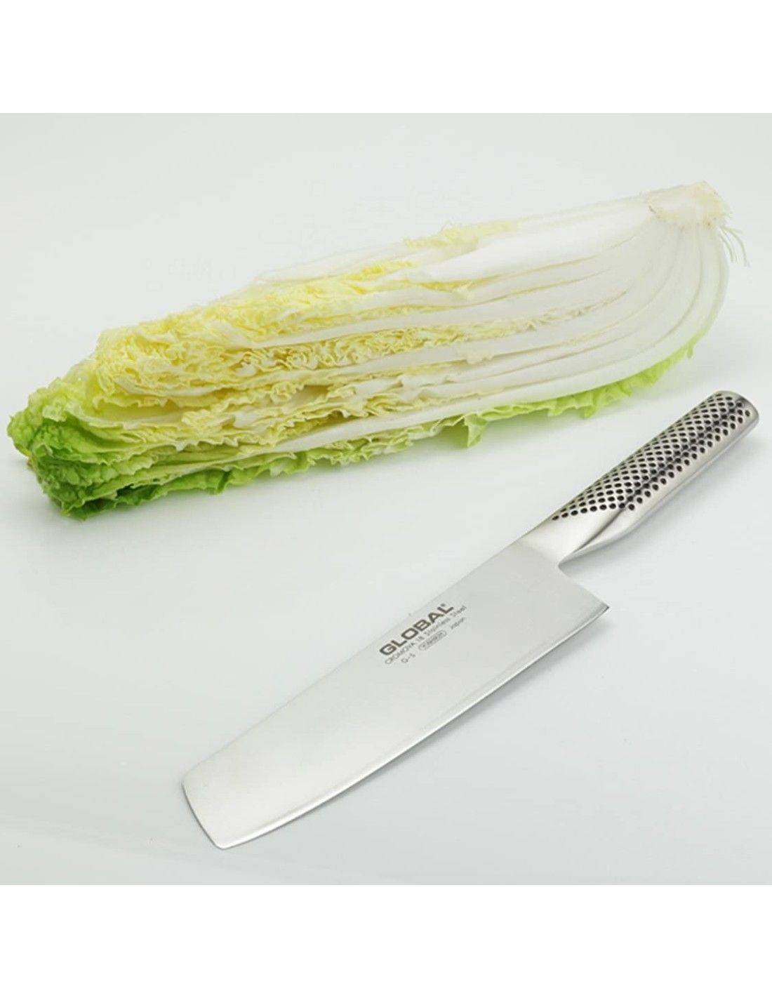 La hoja está fabricada en acero inoxidable CROMOVA 18, con filo convexo y construcción en una sola pieza de acero. El mango hueco con relleno de arena contribuye al equilibrio característico de Global, convirtiendo este cuchillo en una excelente elección para quienes buscan una herramienta dedicada a la preparación de verduras con alto rendimiento.
