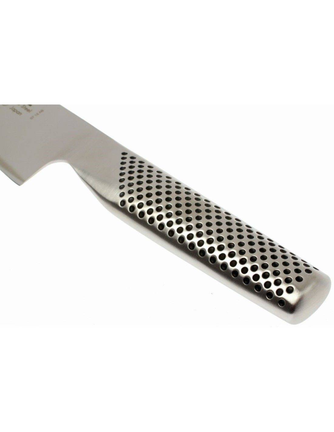 La hoja está fabricada en acero inoxidable CROMOVA 18, con filo convexo y construcción en una sola pieza de acero. El mango hueco con relleno de arena garantiza el equilibrio característico de Global, proporcionando comodidad y estabilidad durante el uso.