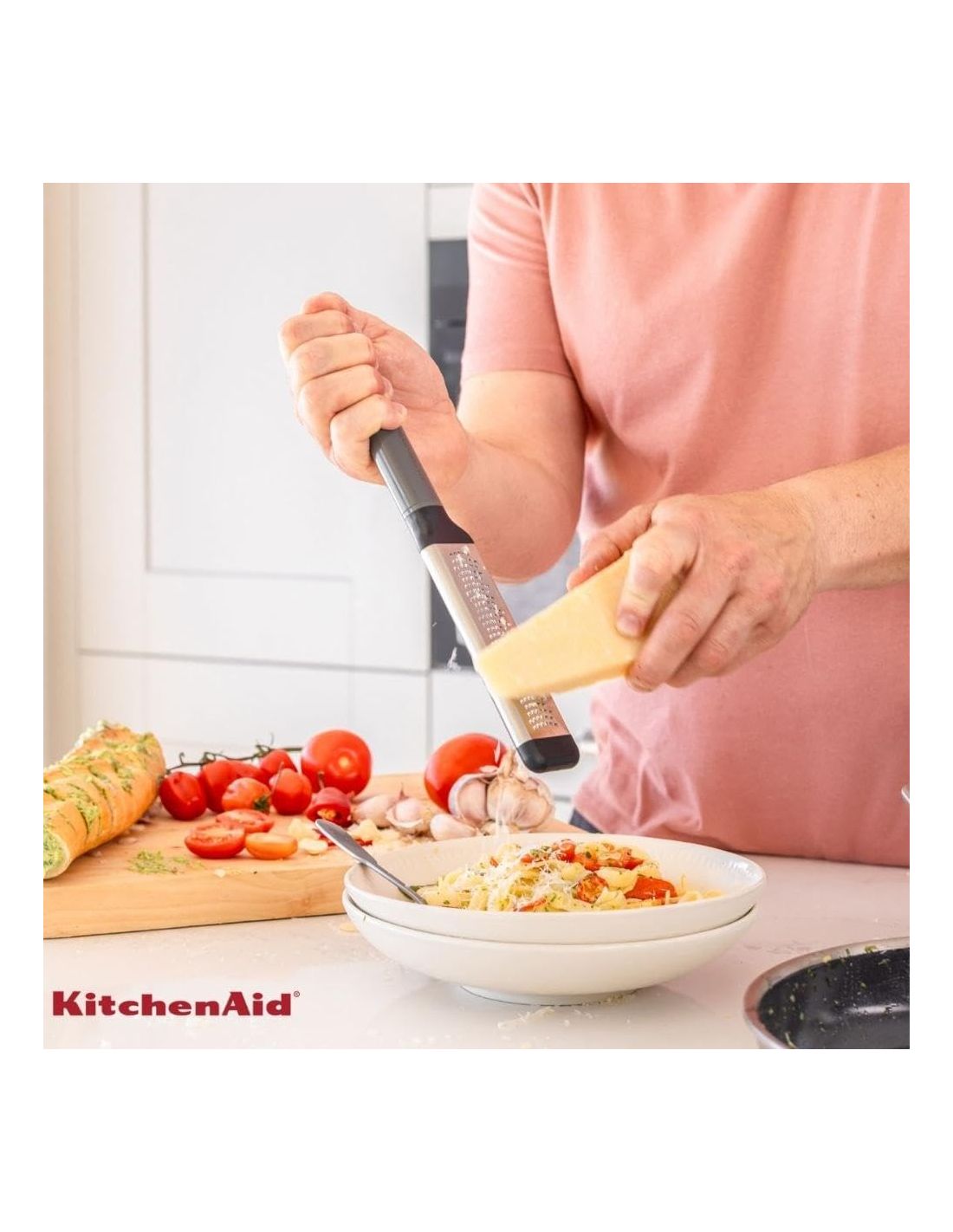 Esta rejilla KitchenAid tiene cuatro cuchillas, gruesas, medianas, finas y en rodajas, para rallar rápidamente queso, chocolate, pan rallado y otros ingredientes. Un compartimento de almacenamiento en la base del rallador para almacenar los alimentos rallados para facilitar el almacenamiento. El recipiente está marcado con capacidades de taza, 1 taza, 1...