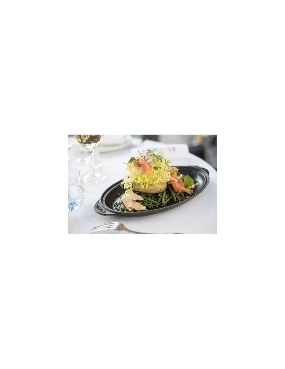 Sirva un pescado fresco directamente del horno a la mesa: así por ejemplo, puede cocinar suavemente un sabroso pescado en este plato de hierro colado de la marca Staub y llevarlo seguidamente a la mesa. El elegante diseño ovalado de color negro lleva la atención al pescado, servido con gran estilo. El plato para presentación tiene una capacidad de 0,7 litros y el pomo de latón de la tapa le confiere una estética atractiva. La tapa está provista de pequeños relieves que devuelven la condensación al pescado, de forma que este se mantiene jugoso y el sabor se despliega en su totalidad. Con las asas mide 36 cm de largo, 8,4 cm de alto y 20 cm de ancho. Como el resto de los productos de cocina Staub, este plato de presentación ovalado destaca por su moderno diseño inspirado en la cocina tradicional francesa. Es de un material resistente y fácil de lavar, que le permite elaborar cómodamente varios platos de pescado fresco para sus familiares y amigos y presentarlos con verdadero estilo.