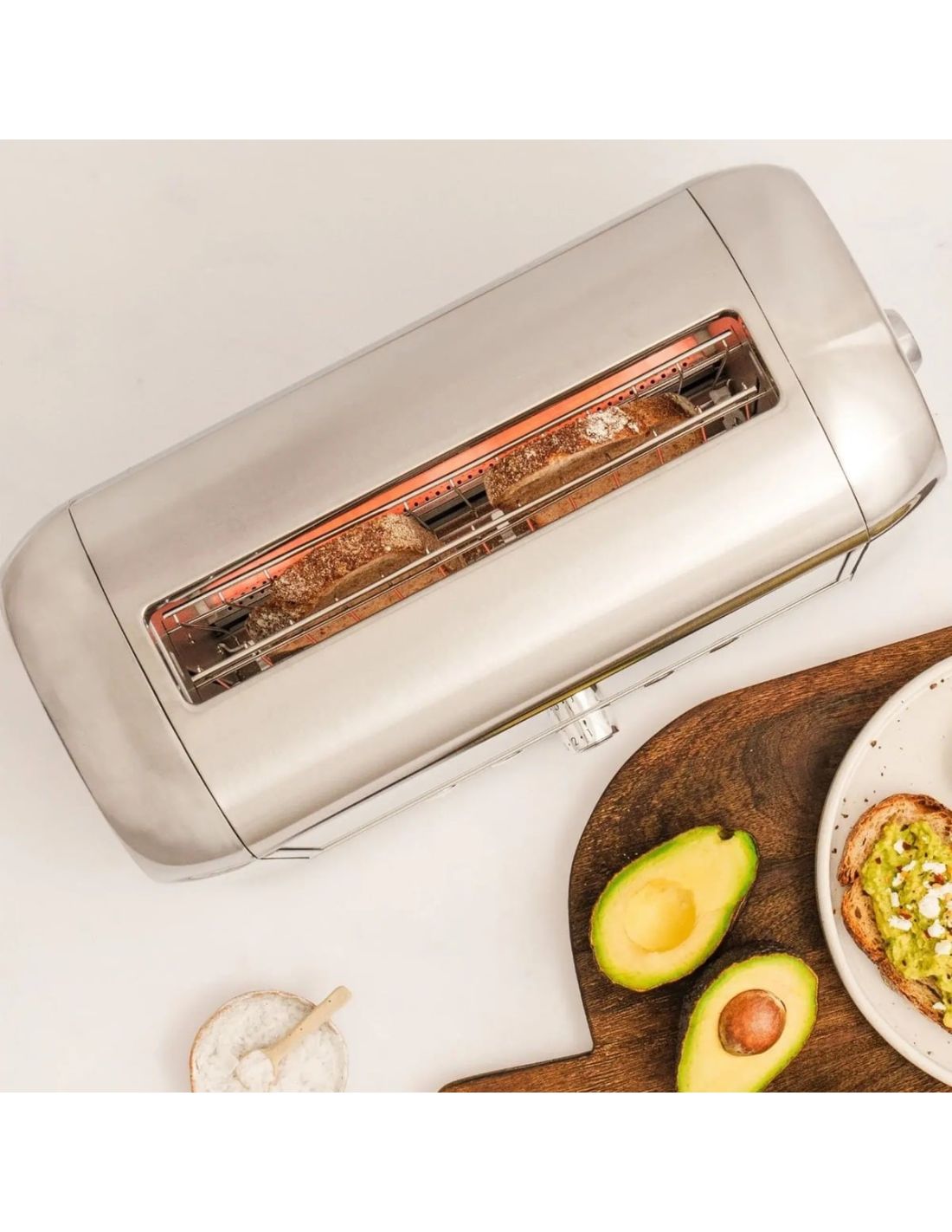 Equipada con ranuras extra anchas, se adapta fácilmente a distintos tipos de pan, incluyendo pan de molde, pan rústico, baguette, bagels, muffins, waffles, teacakes y crumpets. Los cuatro elementos calefactores de cuarzo ayudan a garantizar una distribución uniforme del calor y resultados consistentes, mientras que el control preciso del tiempo de tostado permite ajustar fácilmente el nivel de dorado.