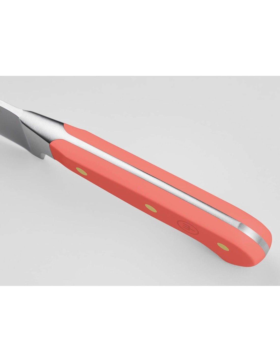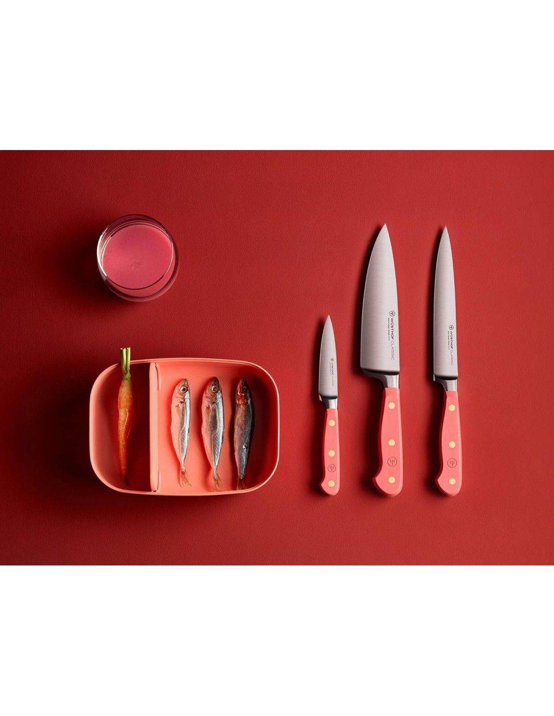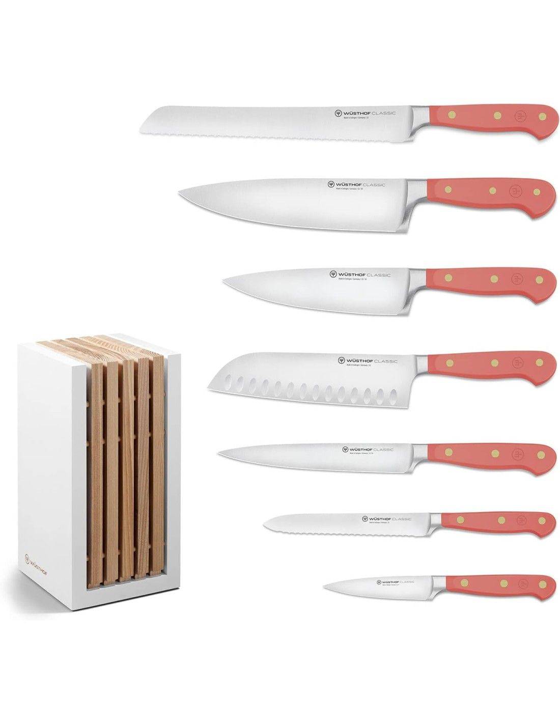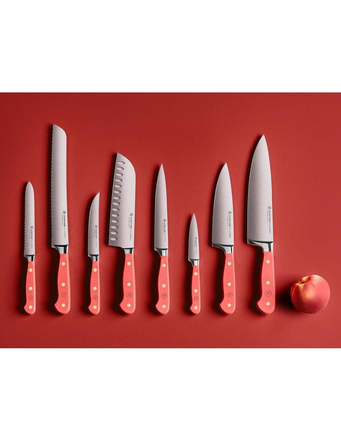 Imagínese esto: entra a la cocina para preparar su comida favorita. En el mostrador hay un hermoso bloque de cuchillos lleno de todos los cubiertos que puedas necesitar para una tarea de cocina. Pero estas no son herramientas culinarias ordinarias: cada hoja se combina con un mango vibrante que agrega un toque sutil de color y estilo a su vida diaria. Elija entre cinco colores de mango únicos (¡inspirados en el mundo culinario!). No importa cómo lo cortes, estos cuchillos infundirán a tu preparación de alimentos un toque extra de alegría y personalidad. ¿Qué es lo que no me encanta de eso?Disfrute de su nuevo bloque de cuchillos lleno de cuchillos WÜSTHOF Classic, combinados con una dosis de color para complementar su estilo de vida y su cocina. Este bloque de cuchillos de diseño con inserciones de fresno aceitado es un placer elegante. El bloque de cuchillos incluye: Cuchillo pelador clásico 9 cm Cuchillo multiusos dentado clásico 14 cm Cuchillo multiusos clásico 16 cm Cuchillo Chef Clásico 16 cm Santoku Clásico con Borde Hueco 17 cm Cuchillo Chef Clásico 20 cm Cuchillo para pan clásico de doble sierra 23 cm