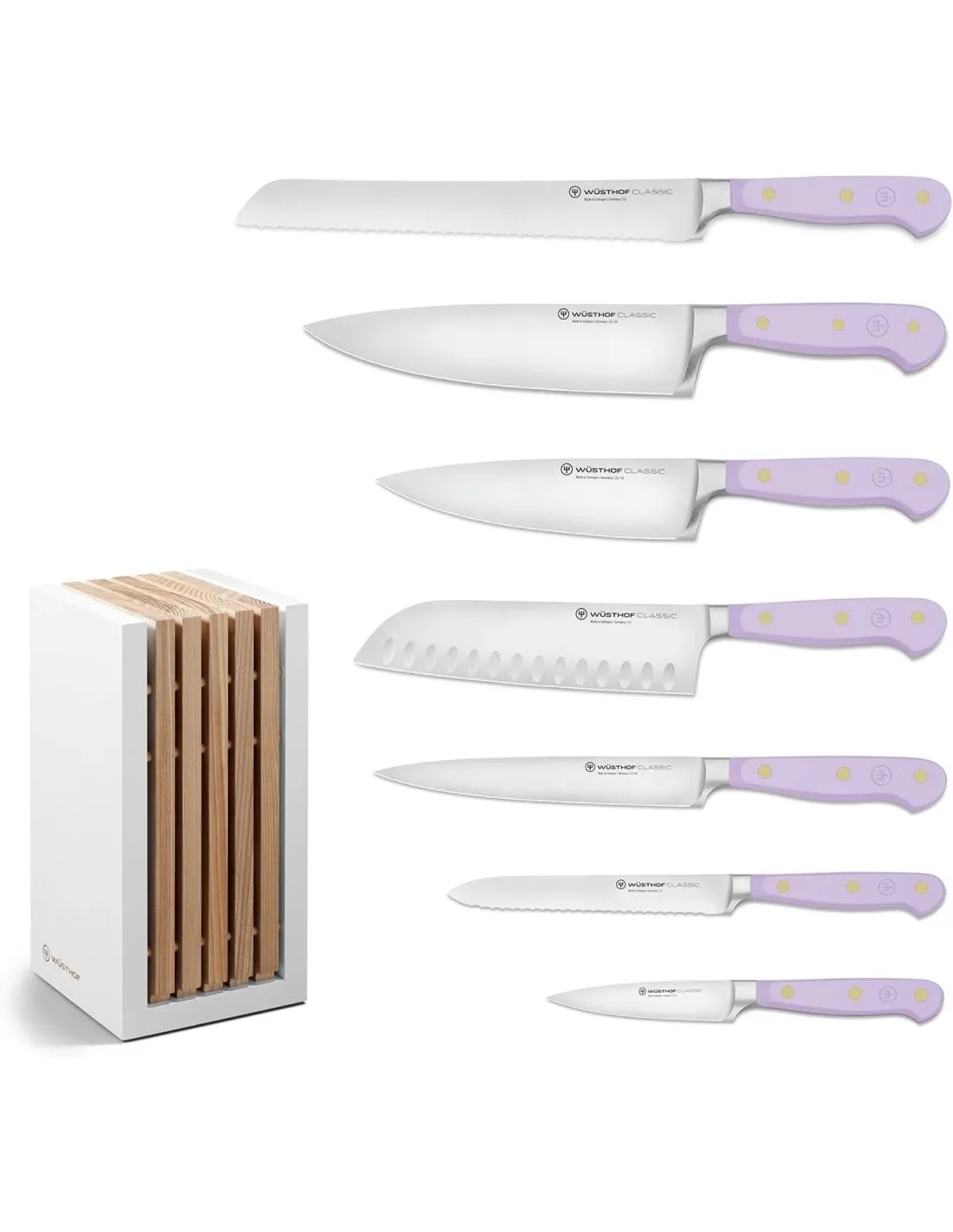Imagínese esto: entra a la cocina para preparar su comida favorita. En el mostrador hay un hermoso bloque de cuchillos lleno de todos los cubiertos que puedas necesitar para una tarea de cocina. Pero estas no son herramientas culinarias ordinarias: cada hoja se combina con un mango vibrante que agrega un toque sutil de color y estilo a su vida diaria. Elija entre cinco colores de mango únicos (¡inspirados en el mundo culinario!). No importa cómo lo cortes, estos cuchillos infundirán a tu preparación de alimentos un toque extra de alegría y personalidad. ¿Qué es lo que no me encanta de eso?Disfrute de su nuevo bloque de cuchillos lleno de cuchillos WÜSTHOF Classic, combinados con una dosis de color para complementar su estilo de vida y su cocina. Este bloque de cuchillos de diseño con inserciones de fresno aceitado es un placer elegante. El bloque de cuchillos incluye: Cuchillo pelador clásico 9 cm Cuchillo multiusos dentado clásico 14 cm Cuchillo multiusos clásico 16 cm Cuchillo Chef Clásico 16 cm Santoku Clásico con Borde Hueco 17 cm Cuchillo Chef Clásico 20 cm Cuchillo para pan clásico de doble sierra 23 cm