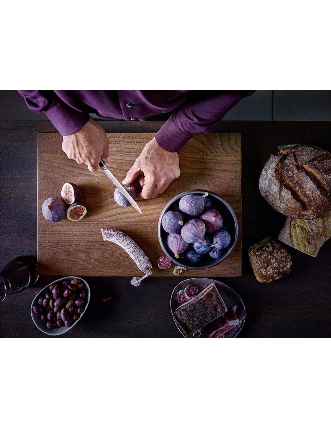 Está especialmente indicado para picar, cortar y laminar ingredientes como chalotas, cebollas, hierbas aromáticas, verduras y pequeñas piezas de carne. Su tamaño intermedio lo convierte en una herramienta muy útil para quienes buscan un cuchillo preciso pero con más alcance que uno pequeño.